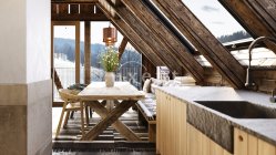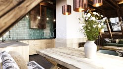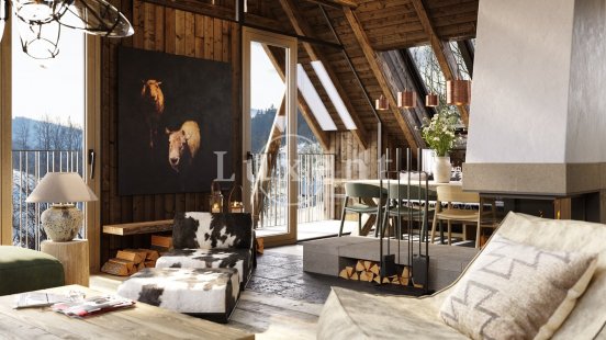 The new residence was created by the architects of Morix studio and is intended for lovers of privacy, original architecture and distinctive style. The apartments have well thought out layouts and novel interior design in a modern rustic mountain style with balconies or terraces and a front garden on the ground floor. Parking is covered at the house and the apartments have ample storage for the whole family's bikes, SNBs and skis in the cellars and in the communal ski room with lockable boxes. The house has an elevator, high standard common area amenities, is heated by heat pumps and the apartments include external blinds and a SMART control system as standard.