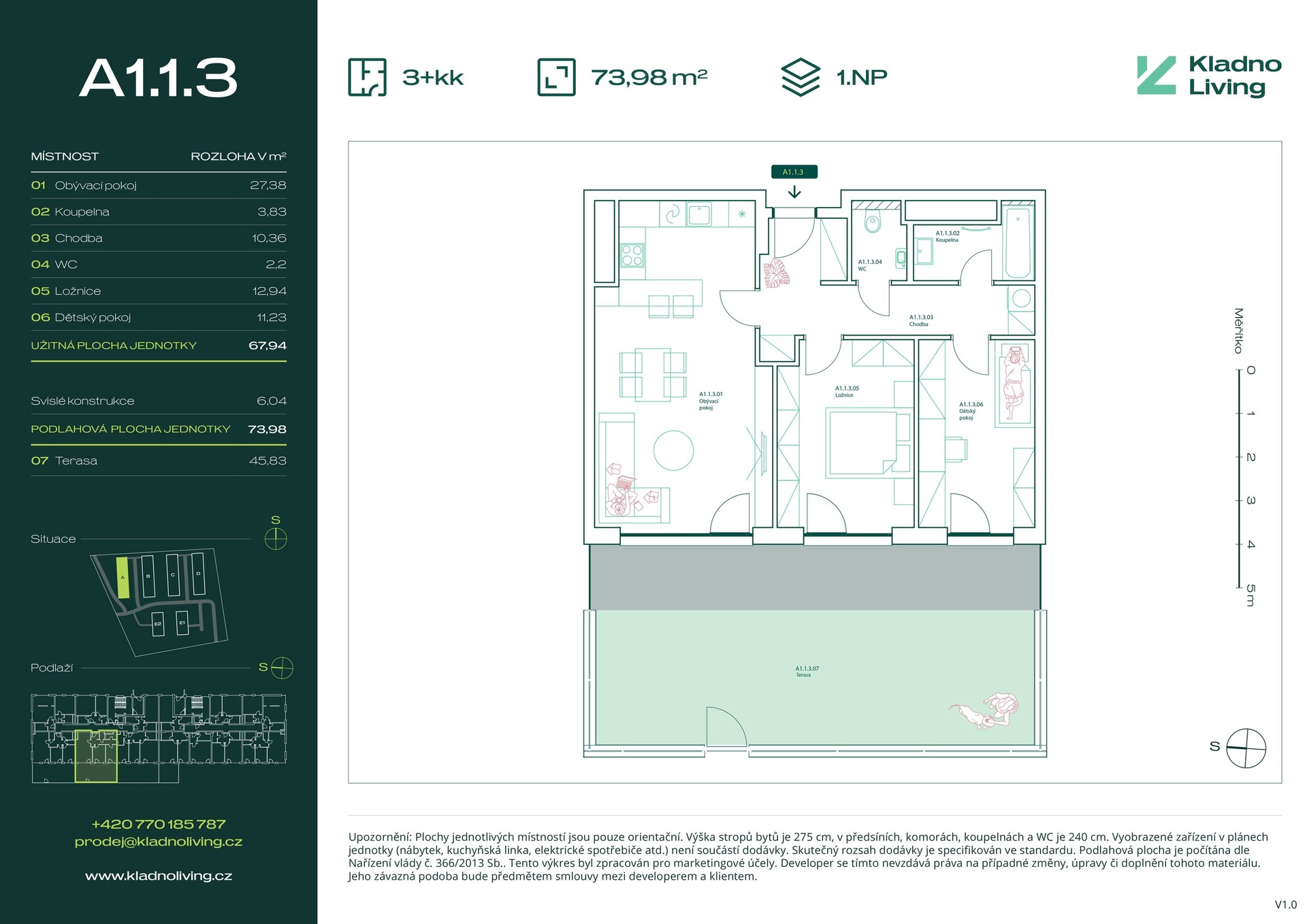 We are offering for sale a modern apartment 3+kt with a floor area of 74 sqm and a terrace of 45,8 sqm in the Kladno Living residential project, which is being built in one of the most attractive locations in the city of Kladno – Kročehlavy. This new development project represents a unique opportunity for those looking for new apartments in Kladno or an investment in real estate with high appreciation potential.