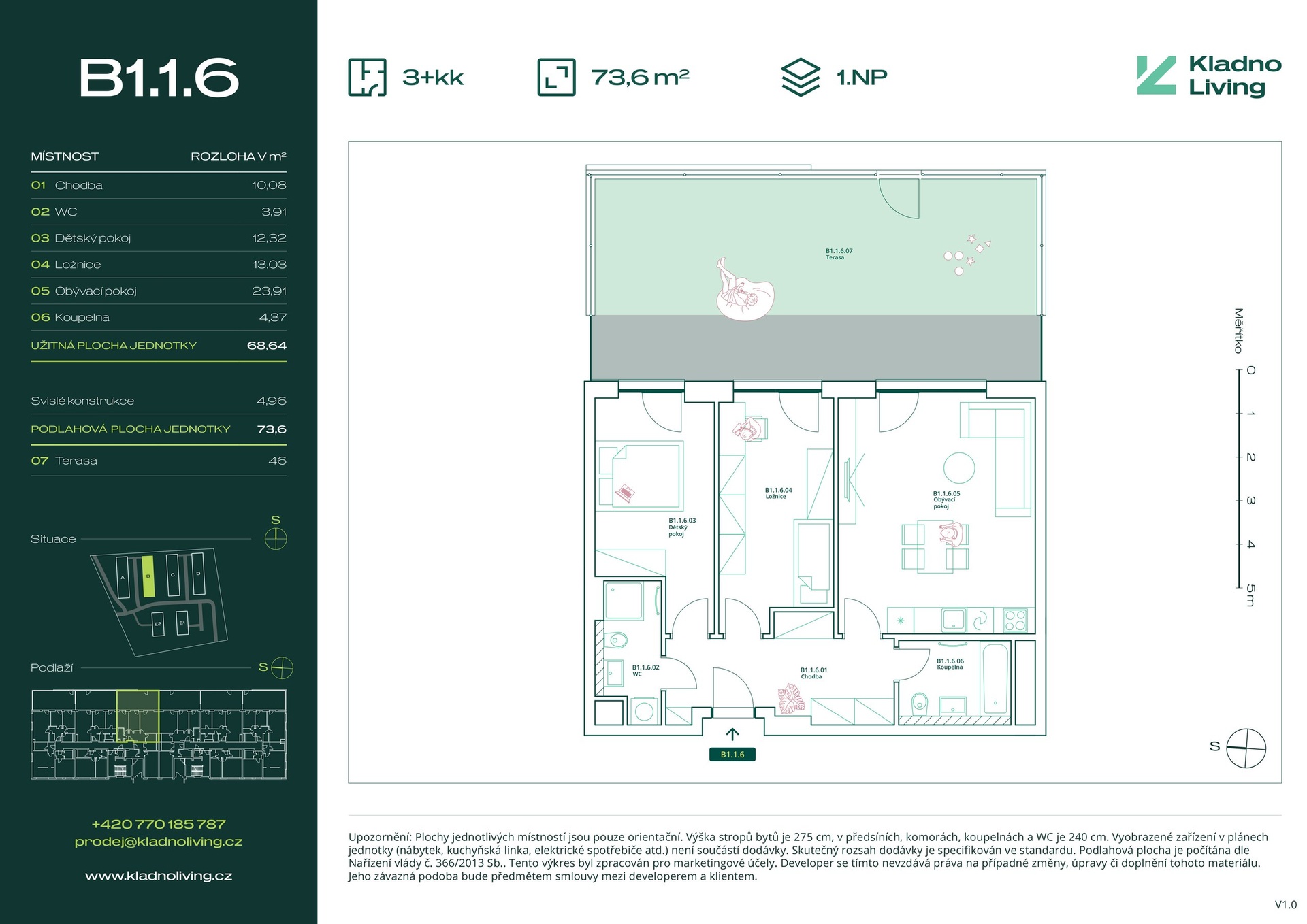 We are offering for sale a modern apartment 3+kt with a floor area of 73,6 sqm and a terrace of 46 sqm in the Kladno Living residential project, which is being built in one of the most attractive locations in the city of Kladno – Kročehlavy. This new development project represents a unique opportunity for those looking for new apartments in Kladno or an investment in real estate with high appreciation potential.