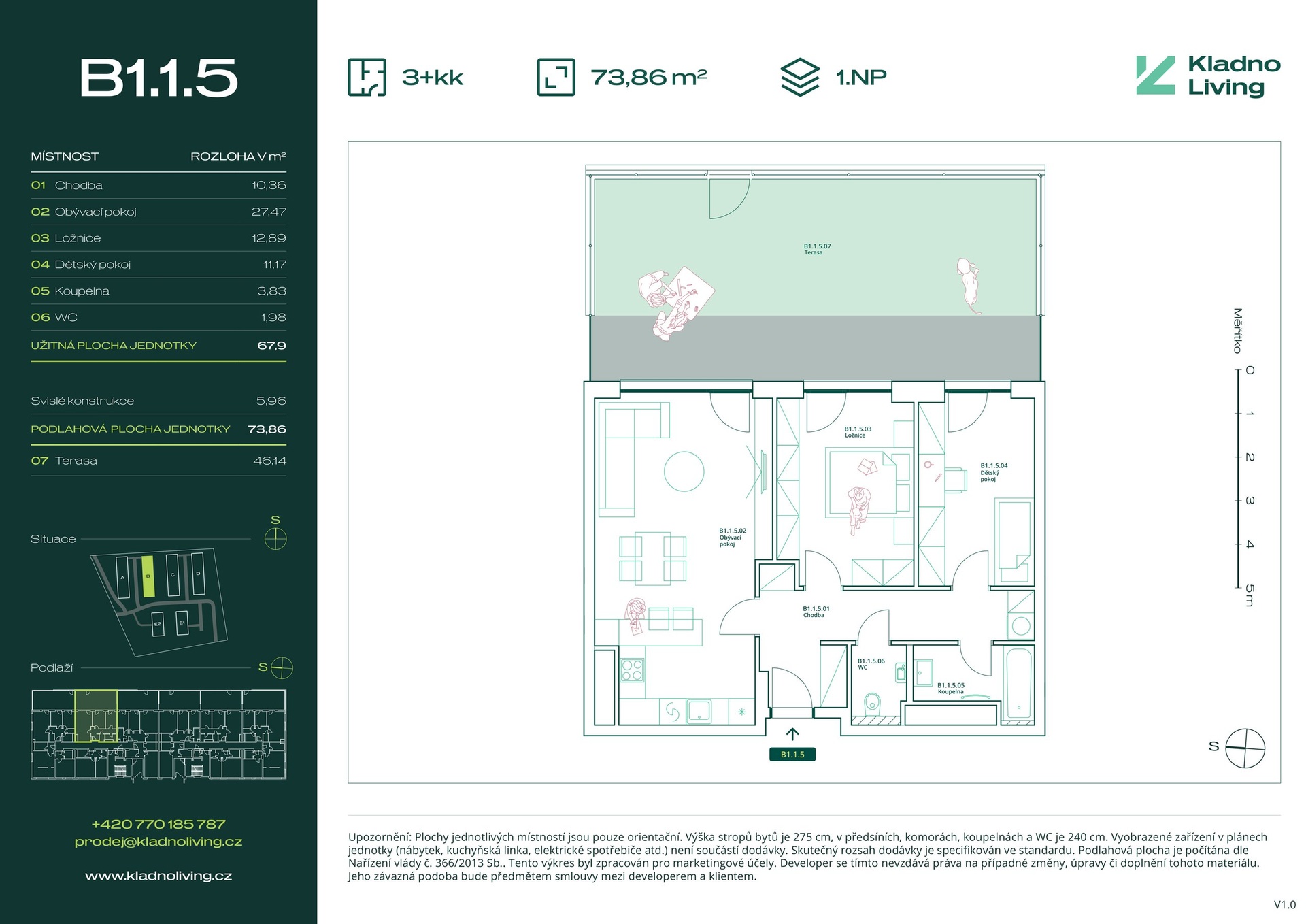 We are offering for sale a modern apartment 3+kt with a floor area of 73,9 sqm and a terrace of 46,2 sqm in the Kladno Living residential project, which is being built in one of the most attractive locations in the city of Kladno – Kročehlavy. This new development project represents a unique opportunity for those looking for new apartments in Kladno or an investment in real estate with high appreciation potential.