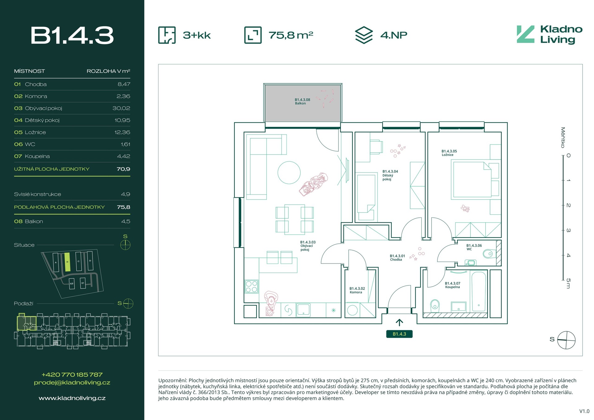 | KL-B143 | 3 + kitchenette | 3rd floor | 71 m2 | 76 m2 | No / 5 m2 / No | No | 8 100 000 CZK | Detail |