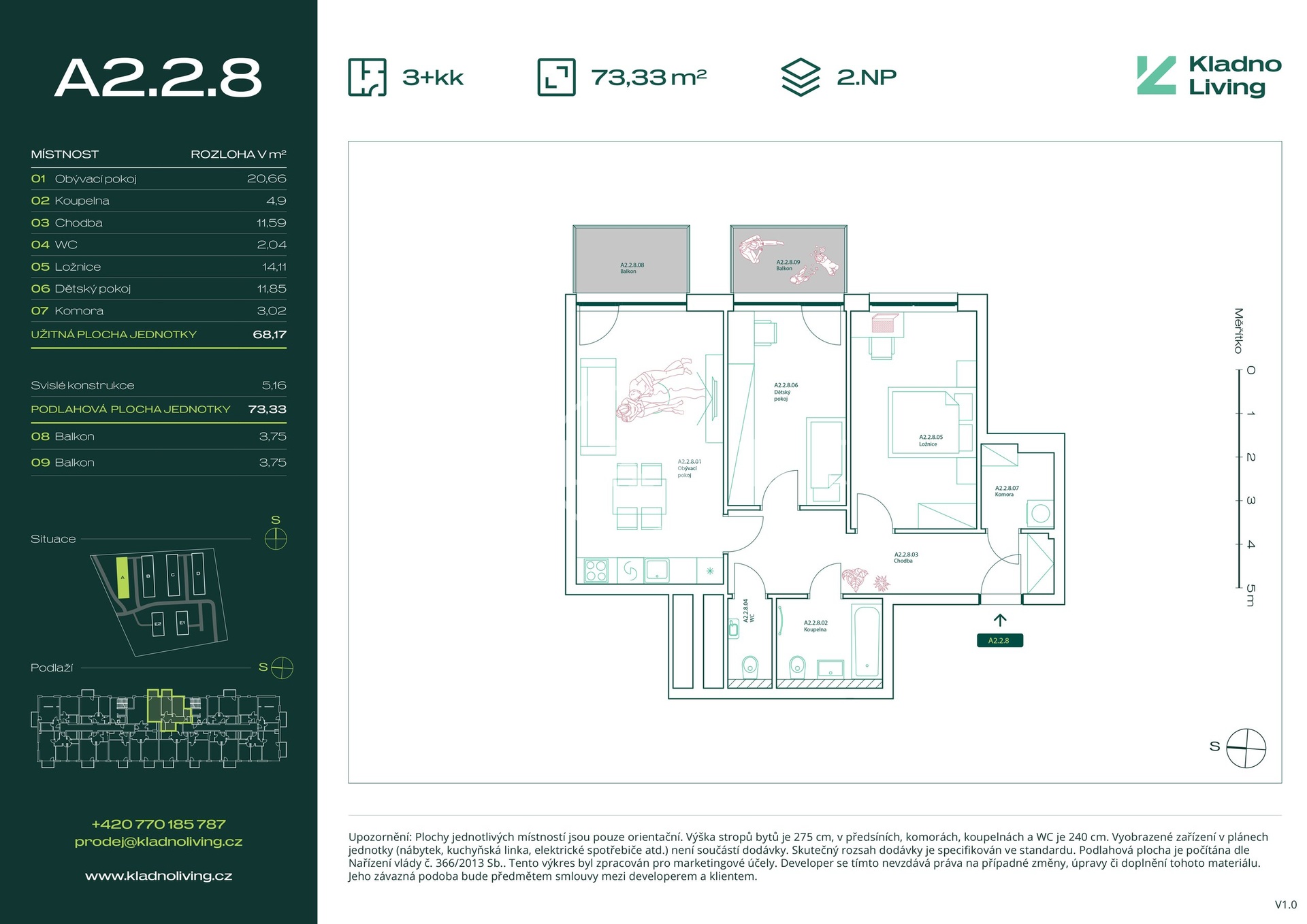 We are offering for sale a modern apartment 3+kt with a floor area of 73,3 sqm and two balconies measuring 3.75 and 3.75 sqm in the Kladno Living residential project, which is being built in one of the most attractive locations in the city of Kladno – Kročehlavy. This new development project represents a unique opportunity for those looking for new apartments in Kladno or an investment in real estate with high appreciation potential.