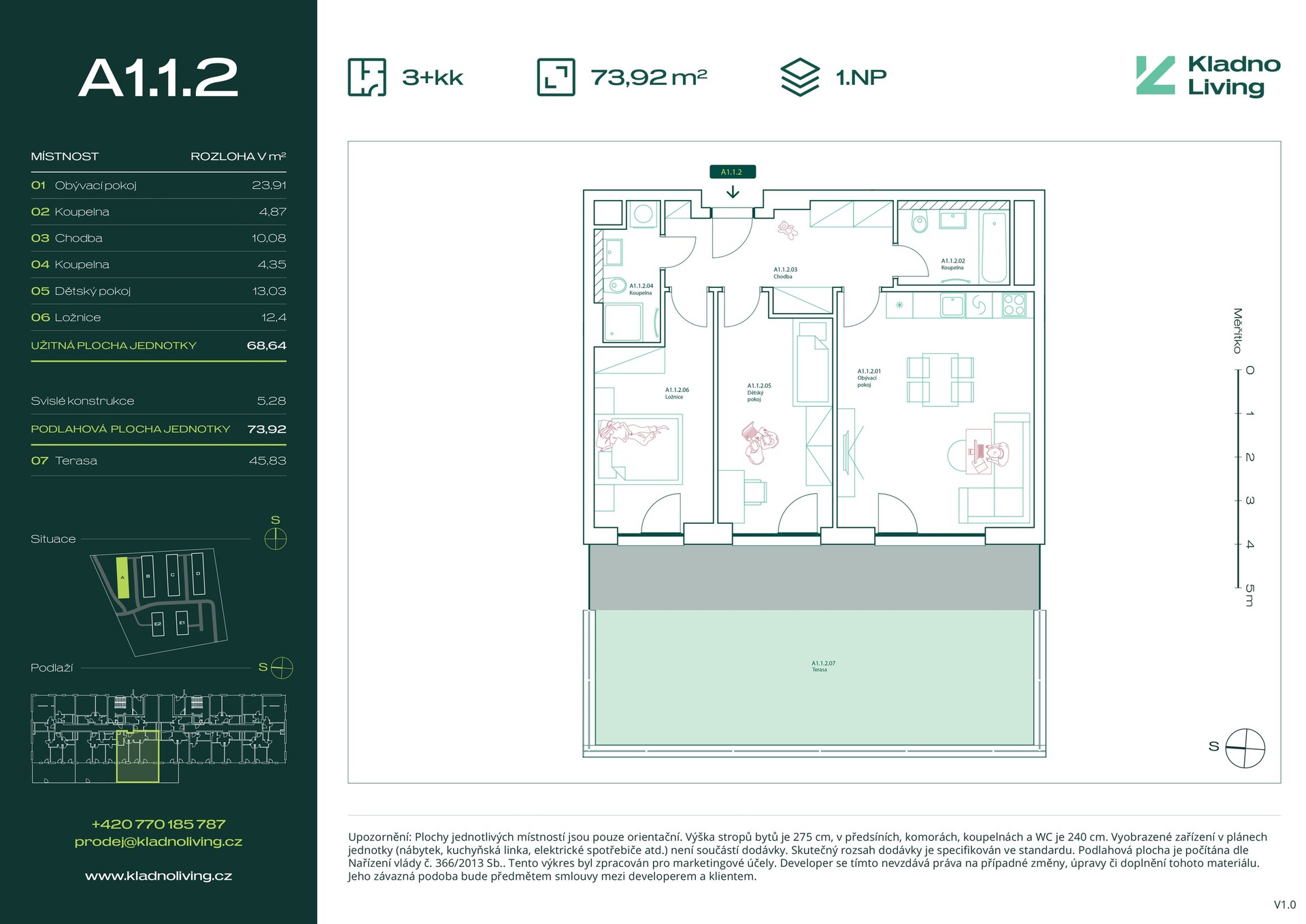 We are offering for sale a modern apartment 3+kt with a floor area of 73,9 sqm and a terrace of 45,8 sqm in the Kladno Living residential project, which is being built in one of the most attractive locations in the city of Kladno – Kročehlavy. This new development project represents a unique opportunity for those looking for new apartments in Kladno or an investment in real estate with high appreciation potential.