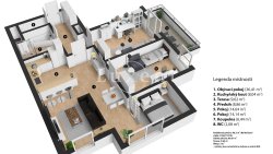 The interior includes an entrance hall, living room with kitchenette and dining room, two bedrooms, bathroom with hydro massage bath and shower, toilet is separate. The kitchen has a bar made of artificial stone and is equipped with all appliances - hob, hood, oven, dishwasher, fridge with freezer. From one bedroom there is access to the terrace with a beautiful view of the surroundings.