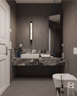 The bathroom is equipped with LAUFEN KARTELL sanitary ware, and EMIL CERAMICA ceramic tiles in modern shades give the bathroom a timeless look.