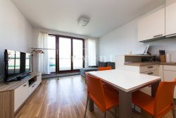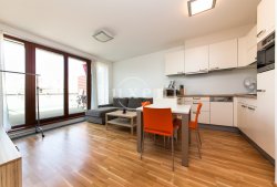 We offer for sale a quality practical apartment 3 + kk (65 sqm) with large terrace (18 sqm) in a quiet courtyard overlooking the greenery. Included in the price is one parking space in an underground garage (750,000 CZK), equipment of the flat in the value of CZK 500,000 and a spacious cellar (4,1 m²). The apartment itself is located on the 7th floor of a new modern building with an elevator (final approval in 2011). Both the house and the apartment are equipped with high-quality materials. The apartment has a clean interior style and quality materials. Parquet made of solid wood, outdoor aluminum blinds, Italian built-in wardrobes. Schiller kitchen fully furnished (Miele appliances, Siemens). The advantage is a very cozy and practical layout. Beside the entrance hall, the bedroom part is separated by another corridor from the living area. Bedrooms are quiet, quiet and provide privacy. The living room is light with a glazed entrance to a large, quiet terrace extending to one of the bedrooms. Practical 2 chambers (washing machine and storage). The apartment is fully oriented to the courtyard and offers sunny quiet accommodation in the very center of Smíchov. Currently, it is lucratively leased and a lease can be accepted. Parking slot available. More information in our office. All civis amenities are of course around, at Metro B Anděl station 5 min. on foot. We recommend the practicality, quality and desired location of Andel.