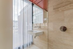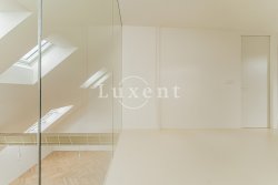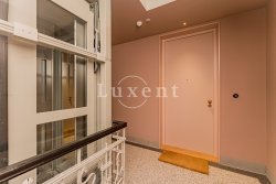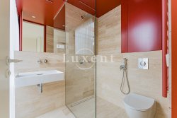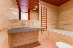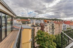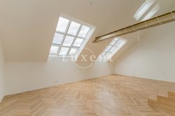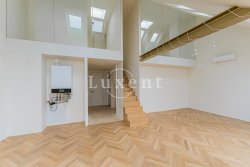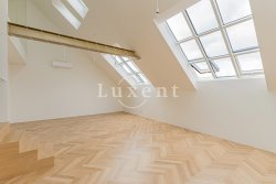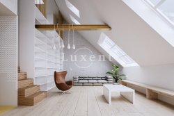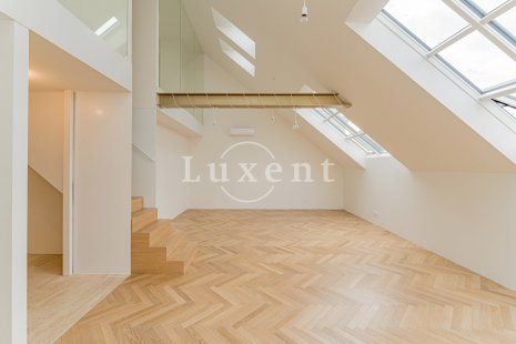 Three-layer wooden parquet and seamless rubber floors in the living rooms. Travertine stone tiles in the entrance hall. The bathrooms have cast terrazzo, stone tiles and travertine tiles. Concrete sink, Vitra, Kartell, Grohe and Kaldewei fittings. The heating is underfloor in all rooms (separately regulated), the source is the Viesmann Vitodens gas condensing boiler. In each living room there is a multisplit air conditioning. The windows are wooden and aluminium with triple glazing, large-format Solara studio windows, Roto roof windows. Height of ceilings in living rooms 260 - 415 cm. The construction system is designed using a steel-concrete horizontal load-bearing structure, vertical load-bearing structures are in combination of Porotherm Aku 250mm thick and steel columns. In the interior, the steel and original wooden elements of the historical roof truss are admitted. The apartment has a cellar (7,83 sqm). The house has a new elevator for up to 7 people.