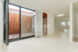 The apartment is dominated by a unique high living space with kitchen and dining room. The sun is brought in by two large studio windows. Upstairs is a bedroom with bathroom and study, which looks through a glass wall into the living room. The second room has the same glass "eye" above the kitchen. From the bedroom and bathroom it is possible to go out onto the green terrace.