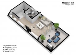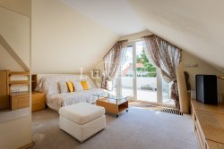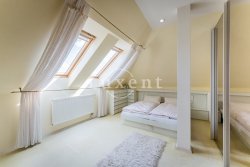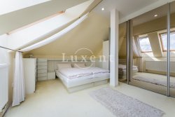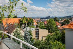 The lower part (118 sqm) of the apartment offers a spacious living room with fireplace, kitchen with dining room, bedroom, dressing room / study, bathroom with bath and shower, separate toilet and storage room. On the upper floor (26 sqm) there is a bedroom, bathroom with bath and toilet and a terrace with magnificent views of Prague Castle and the surrounding area. The non-residential space in the basement can be used as a studio, office or storage.