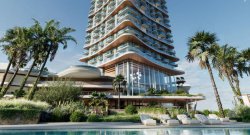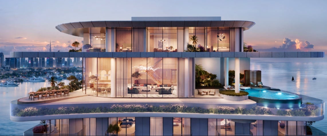 This unique property with its bold design and distinctive 45° tilt has become an icon on Dubai's coastline. Organically meandering terraces blend into the surrounding landscape, with extended balconies and cascading terraces framing the breathtaking views. Transparent glass balustrades blur the boundaries between the interior and the Gulf skyline. The design is complemented by sophisticated retro elements that give the whole an unmistakable character.