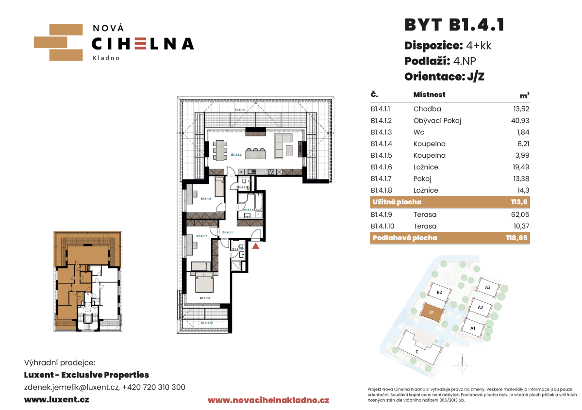 We offer for sale apartment 4+kt with a floor area of 118.65 sqm with two terraces of 62.05 sqm and 10.37 sqm in an extremely economical development project Nová Cihelna Kladno, located in the urban area of Kladno - Rozdělov.
