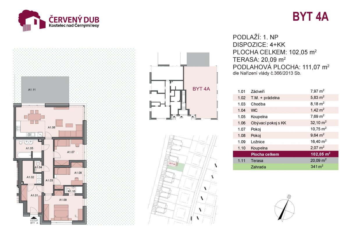 The offered apartment is located on the ground floor of house No. 4, which is part of the construction of the 3rd stage of the project Červený dub, in Kostelec nad Černými lesy. Within this stage, 5 chamber houses will be built, each with only four units. The project is therefore an excellent solution for those who prefer a quieter and healthier lifestyle close to nature with good access to larger cities. There is a beautiful undulating forest landscape around the project, and you can reach Prague or Říčany or Český Brod in a few tens of minutes by car or bus, or even by train. A great advantage of the project houses is self-sufficiency in electricity production. All the houses have a system of roof photovoltaic panels. The energy performance of the building is B - very energy efficient.