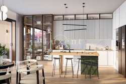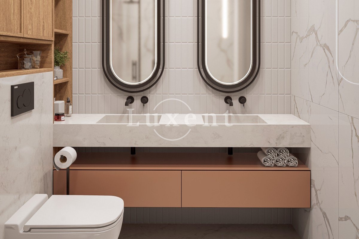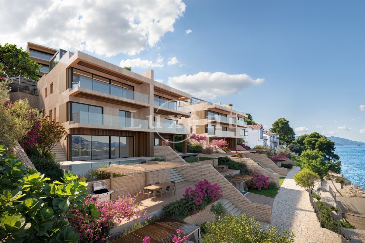The outdoor space is designed in a cascading style – terraces with gardens, a private pool, and relaxation areas ensure maximum privacy and a feeling of having your own home, even though the apartment is located in a smaller residential building with four units. There are also common areas, including a rooftop terrace with sun loungers and sea views, a fitness center, a sauna in the basement, and another pool. One covered parking space is included, with the option to purchase a garage.