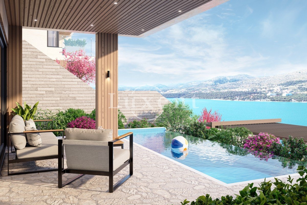 We are offering for sale a luxury apartment with a garden and private pool in Okrug Donji. The 132.46 m² apartment on a 293.63 m² plot is located in the first row by the sea and offers direct access to a landscaped sun terrace with views to the north, south, and east.