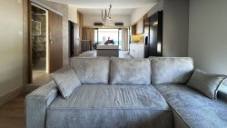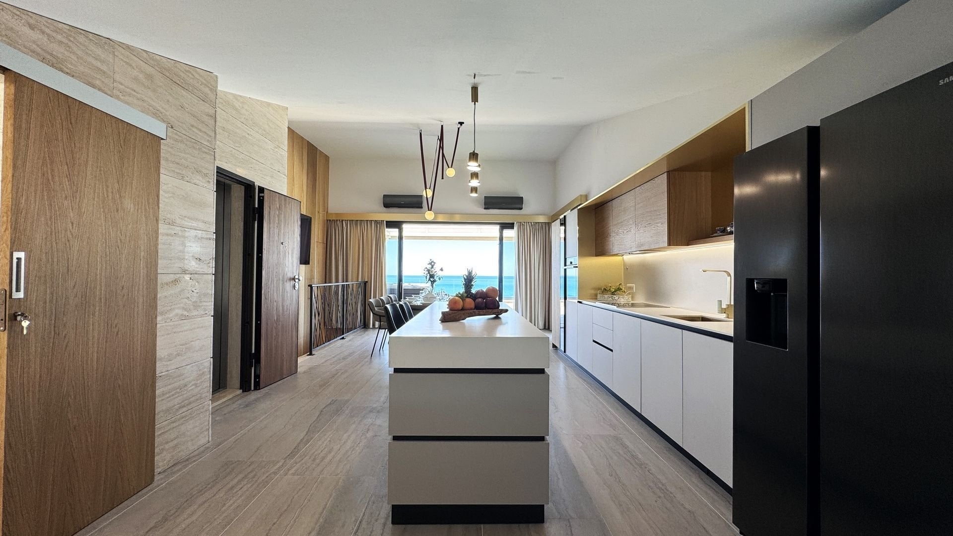 The penthouse, with a total living area of 118 sqm, is elegantly laid out over the top two floors of a small residential building. Access is provided by a lift and staircase. The first floor offers an entrance hall, three stylishly furnished bedrooms – each with its own balcony and beach views – two modern bathrooms and a practical storage room. An internal staircase leads to the upper floor, where there is an open-plan living area connecting the kitchen, dining room, and living room. Thanks to the large glass surfaces, the entire space is bright and flows seamlessly onto a spacious terrace.