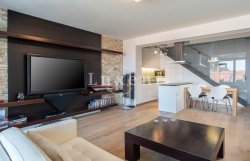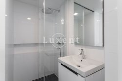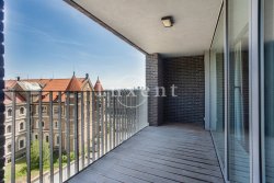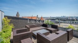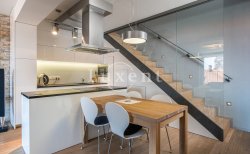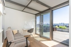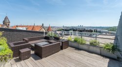 From the central entrance hall, separate doors lead to two bedrooms and a spacious living room. In the hall you find also a cloakroom, bathroom and the second bathroom with the toilet, and technical space with washing machine and dryer. The living room (50 sqm) offers glass wall with views on the loggia, in the front there is a fully equipped kitchen in white lacquer with a wooden massive dining room. Two bedrooms (both 21 sqm) are lit by French windows, east facing, one of them with entrance to the loggia again. Both are fitted with new built-in wardrobes on one wall. On the upper floor there is another full-glazed bedroom / office with automatically controlled shading and a skyview. Exit from the bedroom to the roof terrace with plants and seating (45 sqm, South orientation). The terrace offers an open panoramic view of Prague towards the Vltava River up to Vyšehrad or the Petřín Park. There is also an indoor shed for seasonal furniture storage. Automatic irrigation is introduced. The overall reconstruction of the flat in 2016 included construction work, changing floors, kitchen units, staircase lining, new glazed superstructure on the terrace, storage space, etc.