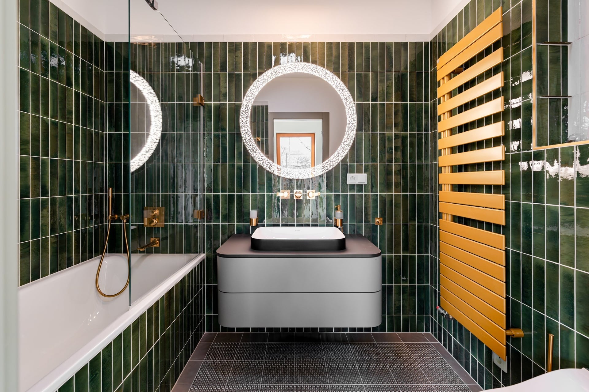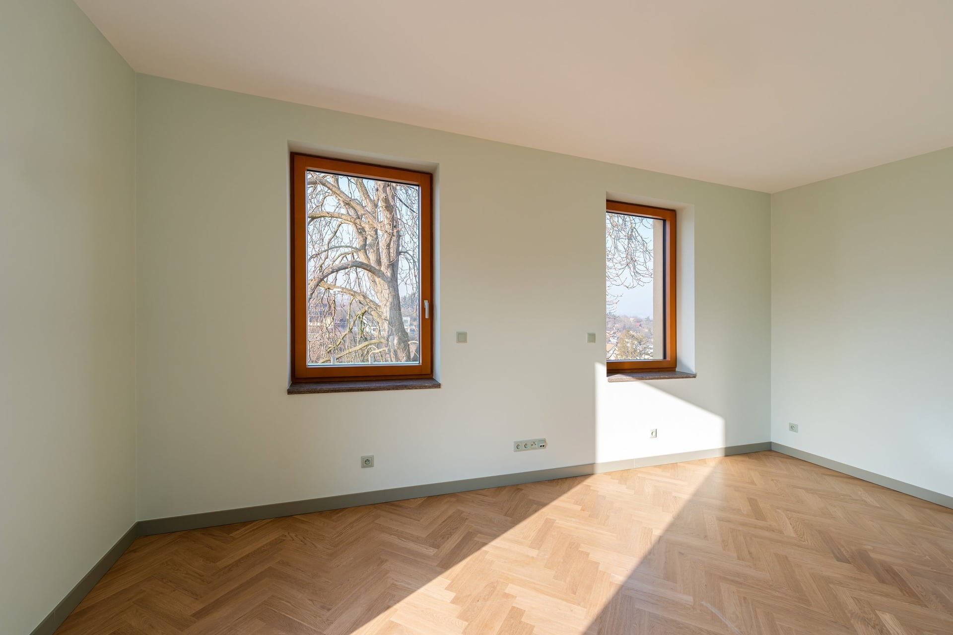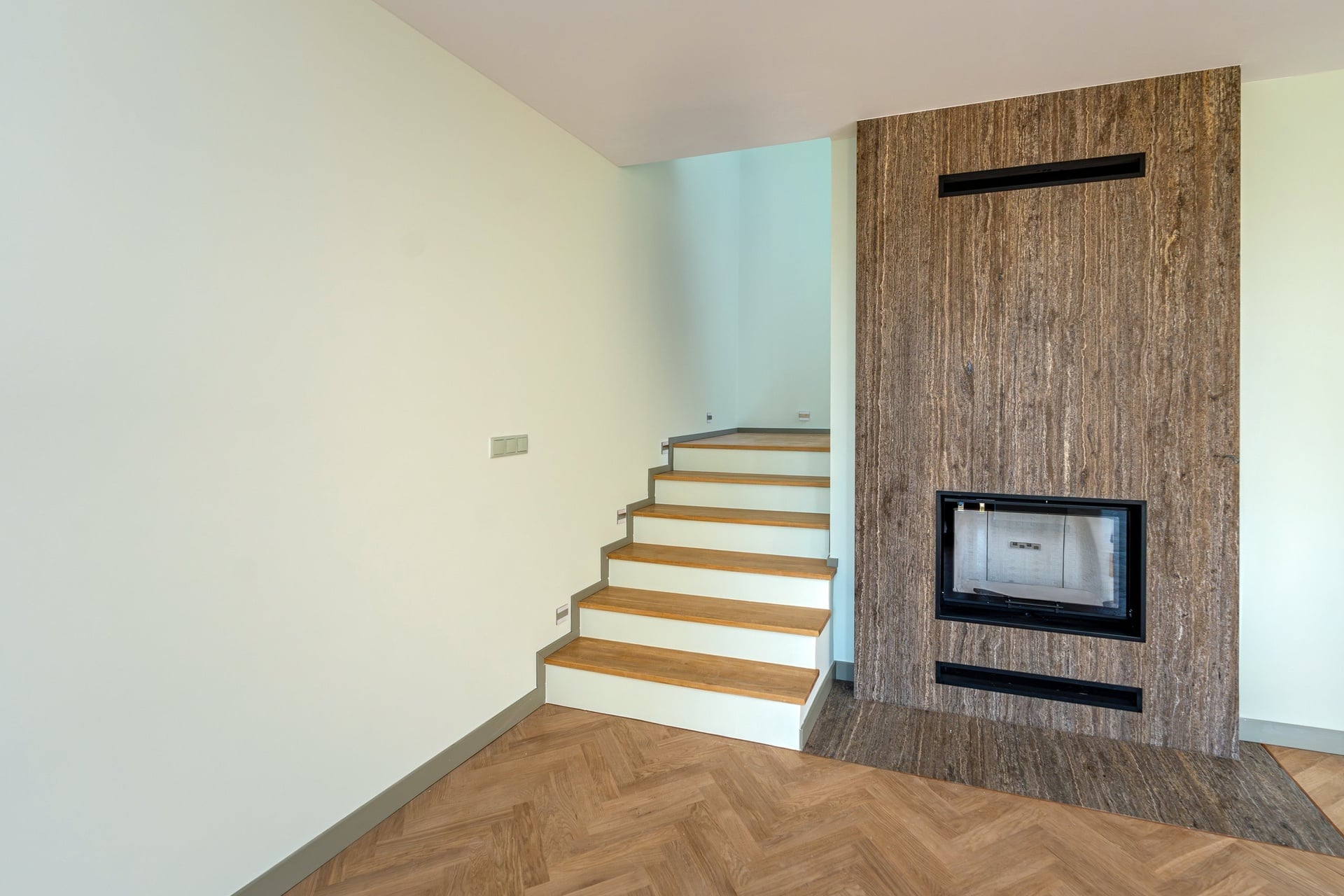 The interior of the first floor is creatively divided into two sections – the living area and the private section. The bright entrance hall with space for built-in wardrobes leads to the kitchen and the generous living room with a fireplace (58 m²), or to the hallway with a technical room, separate toilet, and entrance to the bedroom (18 m²) with a bathroom (3.80 m²). The living room and kitchen offer a fantastic view and an unparalleled atmosphere.
