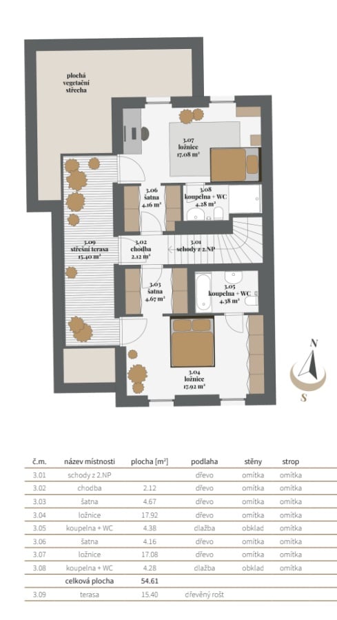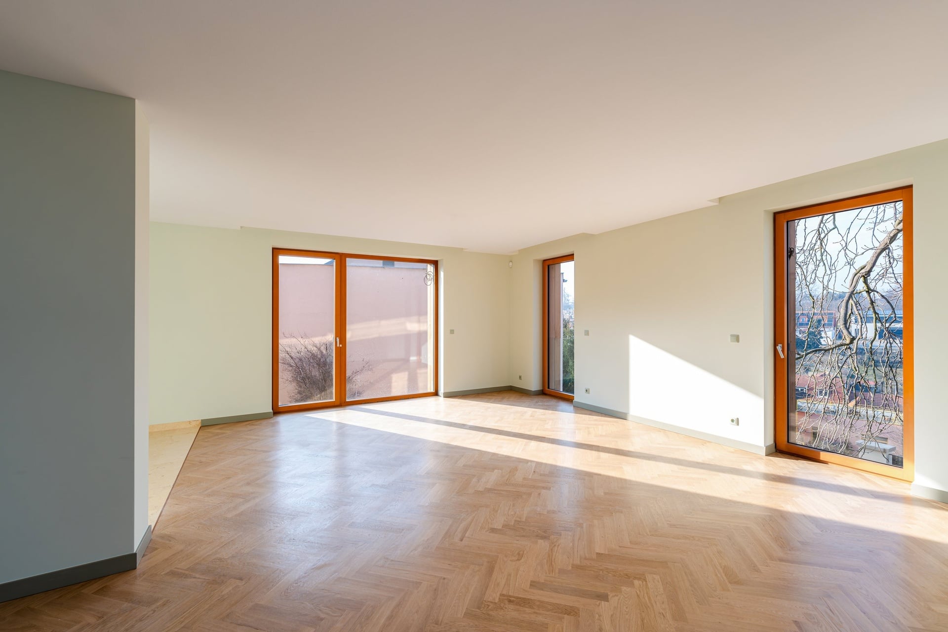 We offer for sale an exceptional duplex apartment in the second phase of the *Rezidence Pod Rybníčkem* project, with a layout of 4+kk and a private entrance, providing maximum privacy and stunning views in the popular location of Prague 6 – Suchdol. This designer apartment, with a total usable area of 283 m², meets the standards of a family home. The floor area of the apartment is 154 m², the garden is 114 m², and the rooftop terrace measures 15.40 m². The apartment includes two parking spaces and a storage room.