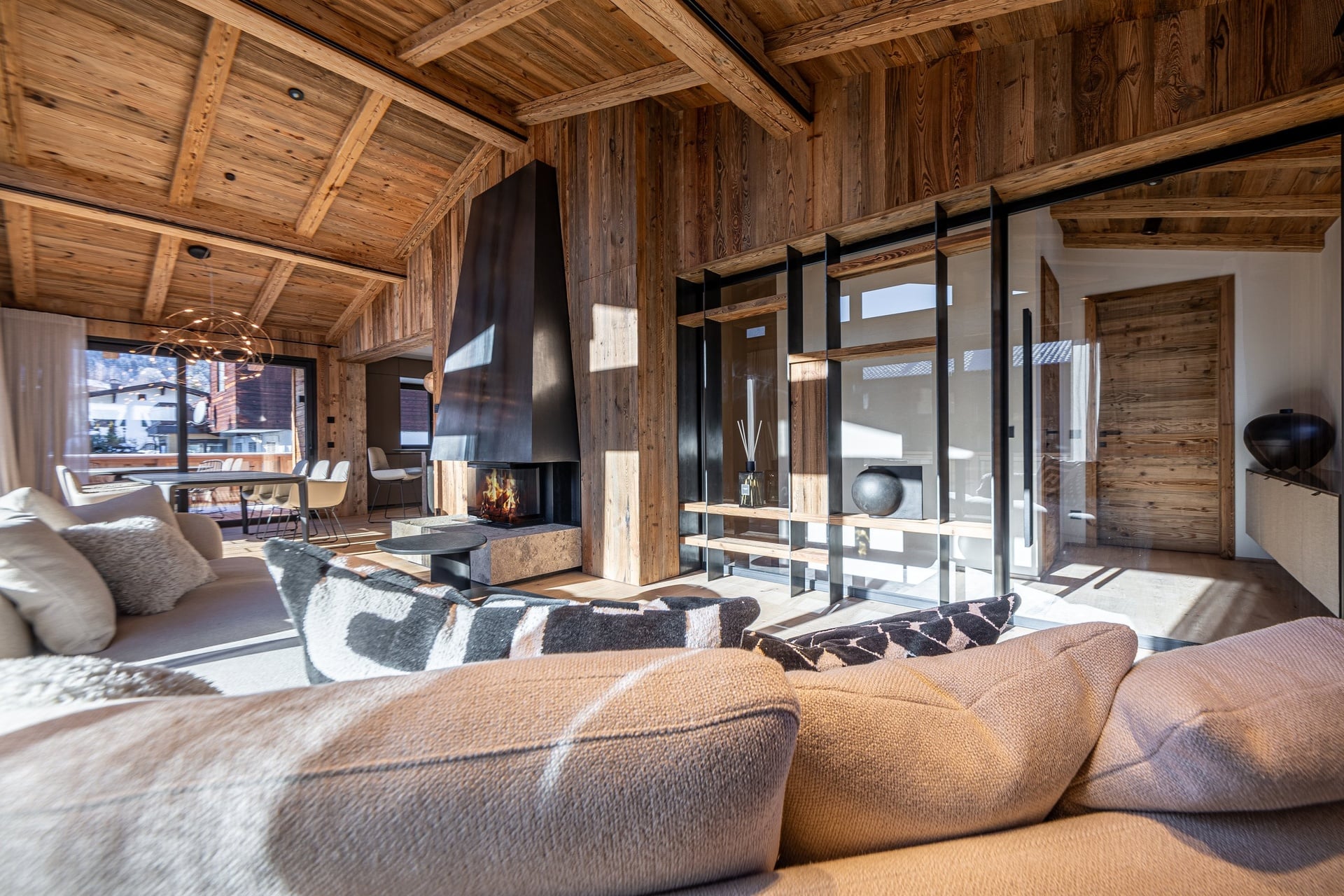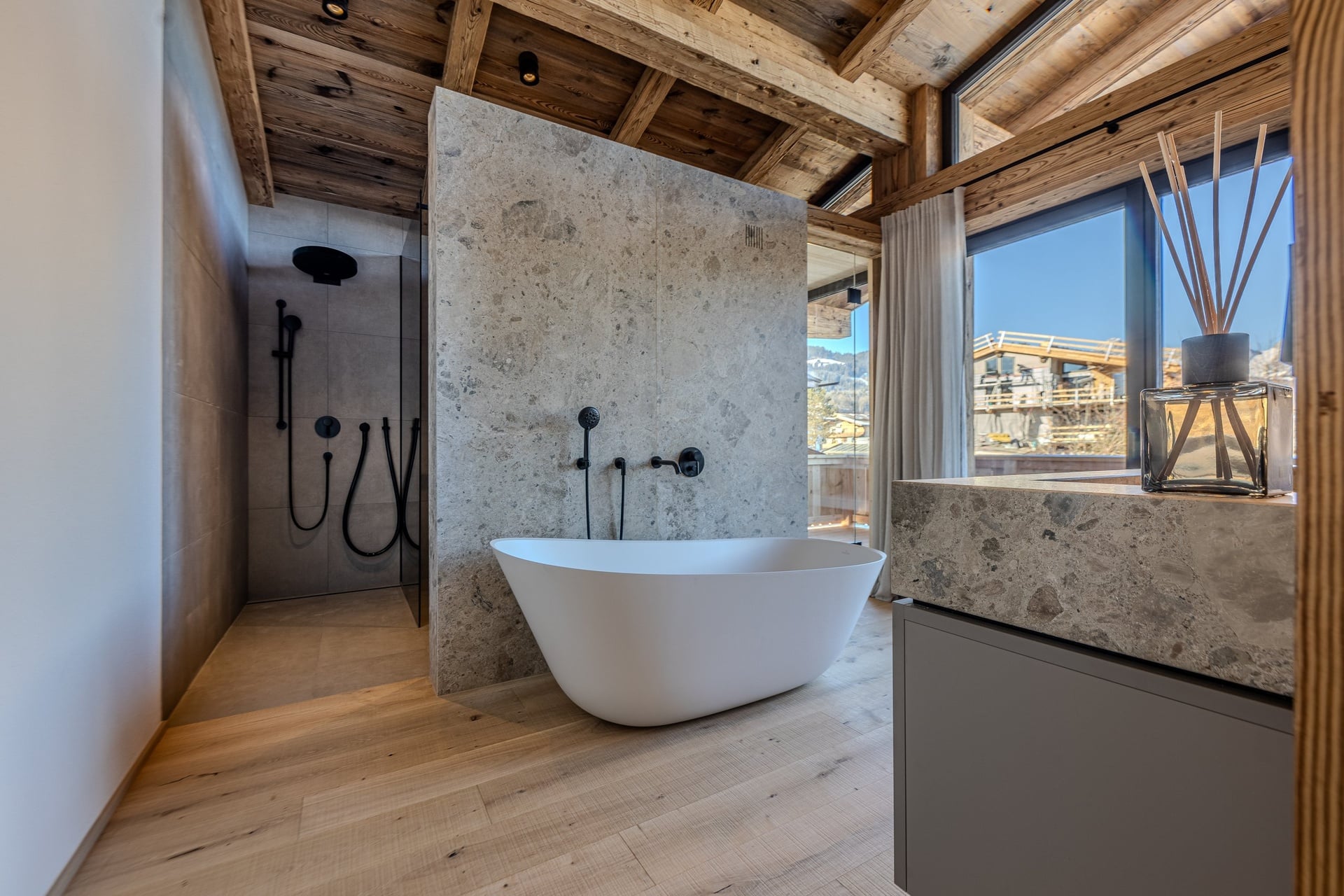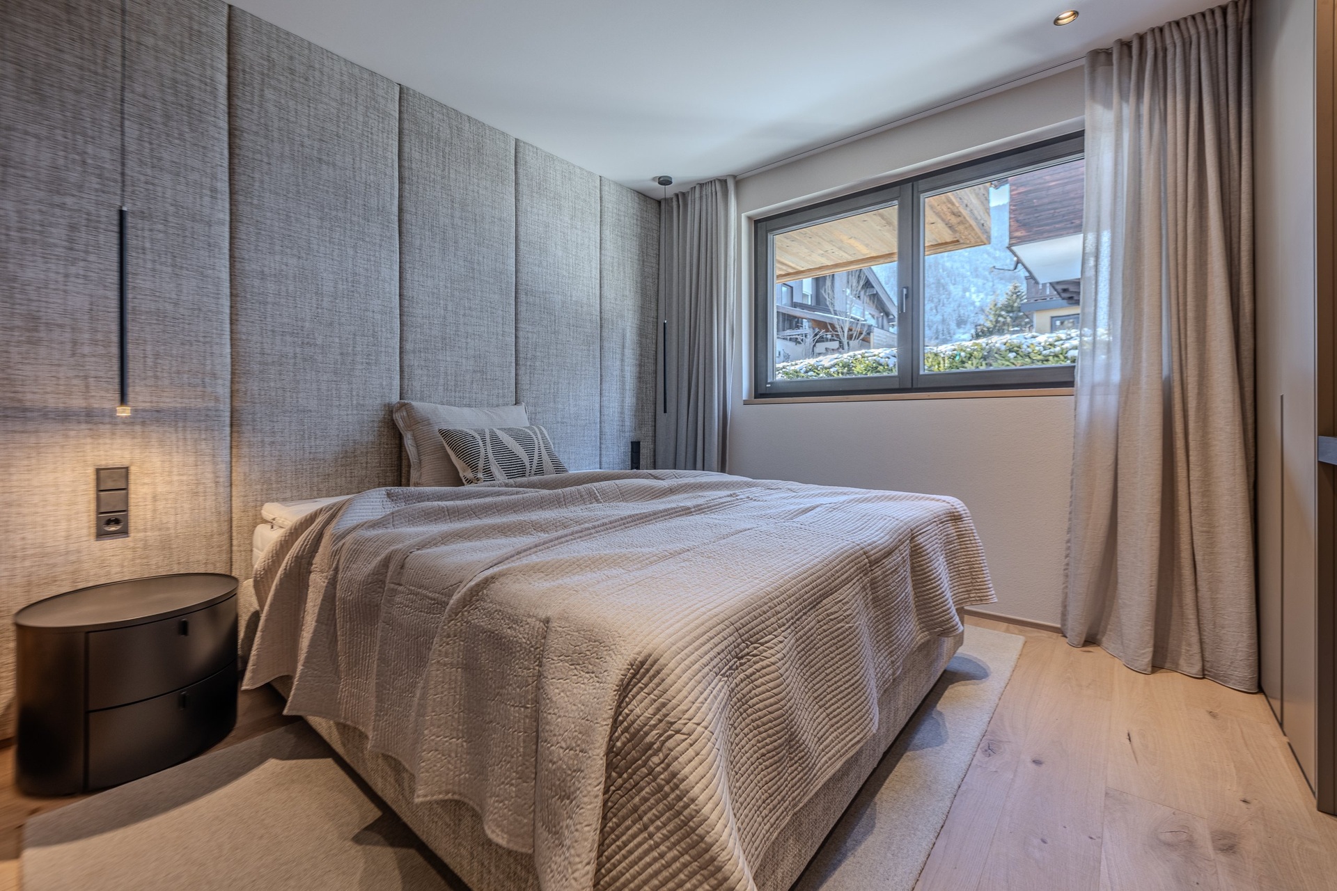 The penthouse is spread over two levels. On the ground floor, you will be welcomed by an elegant entrance hall and two bedrooms, each with its own en-suite bathroom, ensuring complete privacy and comfort for family or guests. High-quality materials, including rustic oak floors, emphasize the luxurious character of this home. On the upper level, you'll find an open-plan living and dining area that is flooded with natural light thanks to its south-facing orientation. The generous space, complemented by a designer fireplace and a premium Poliform kitchen, creates the perfect place for socializing and relaxation. The master bedroom with its own bathroom offers breathtaking views of the imposing Wilder Kaiser, making this space truly exceptional. The luxurious atmosphere is further enhanced by a private sauna, a smart home system with a modern bus system, and eco-friendly underfloor heating powered by sustainable geothermal energy. The property includes two covered parking spaces, an outdoor parking space, and a practical storage room for skis and sports equipment.
