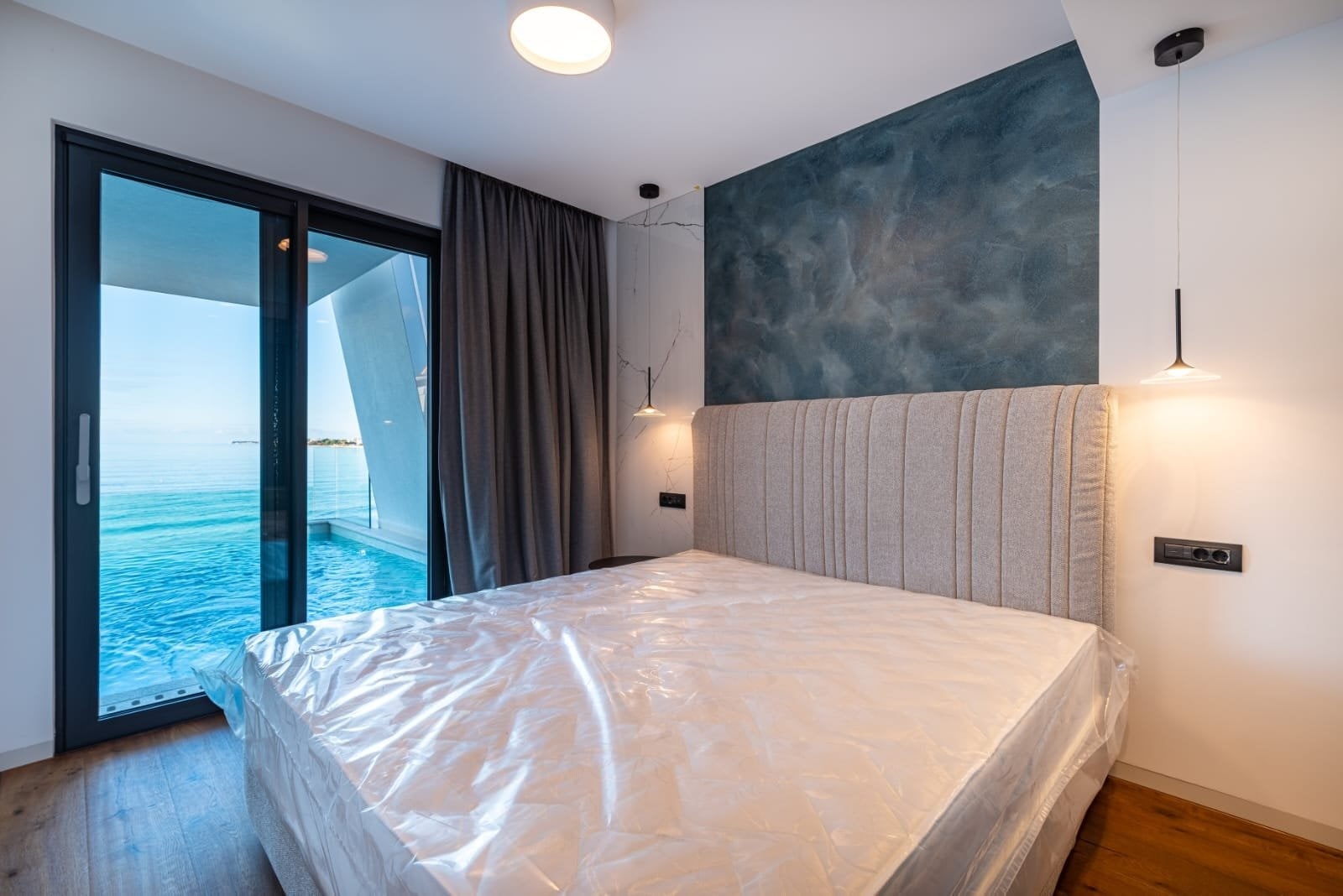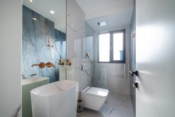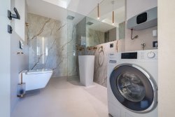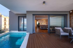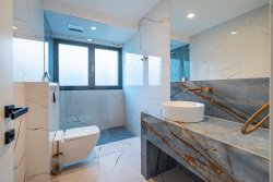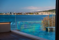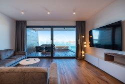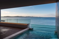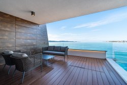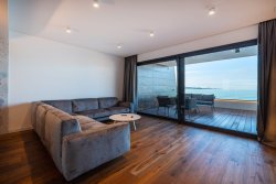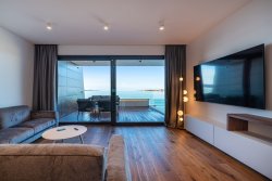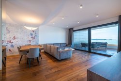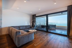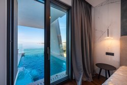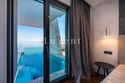 The apartment, with an area of 144 sqm, includes three bedrooms, an open-plan living space with a fireplace, a kitchen and dining area, two bathrooms, walk-in closets, and a private wellness area. The highlight is the spacious, sunny covered terrace with a pool, offering stunning sea views. From this private terrace, there is direct access to a quiet, pristine pebble beach, equipped with an outdoor toilet, shower, and a gradual entry into the sea.