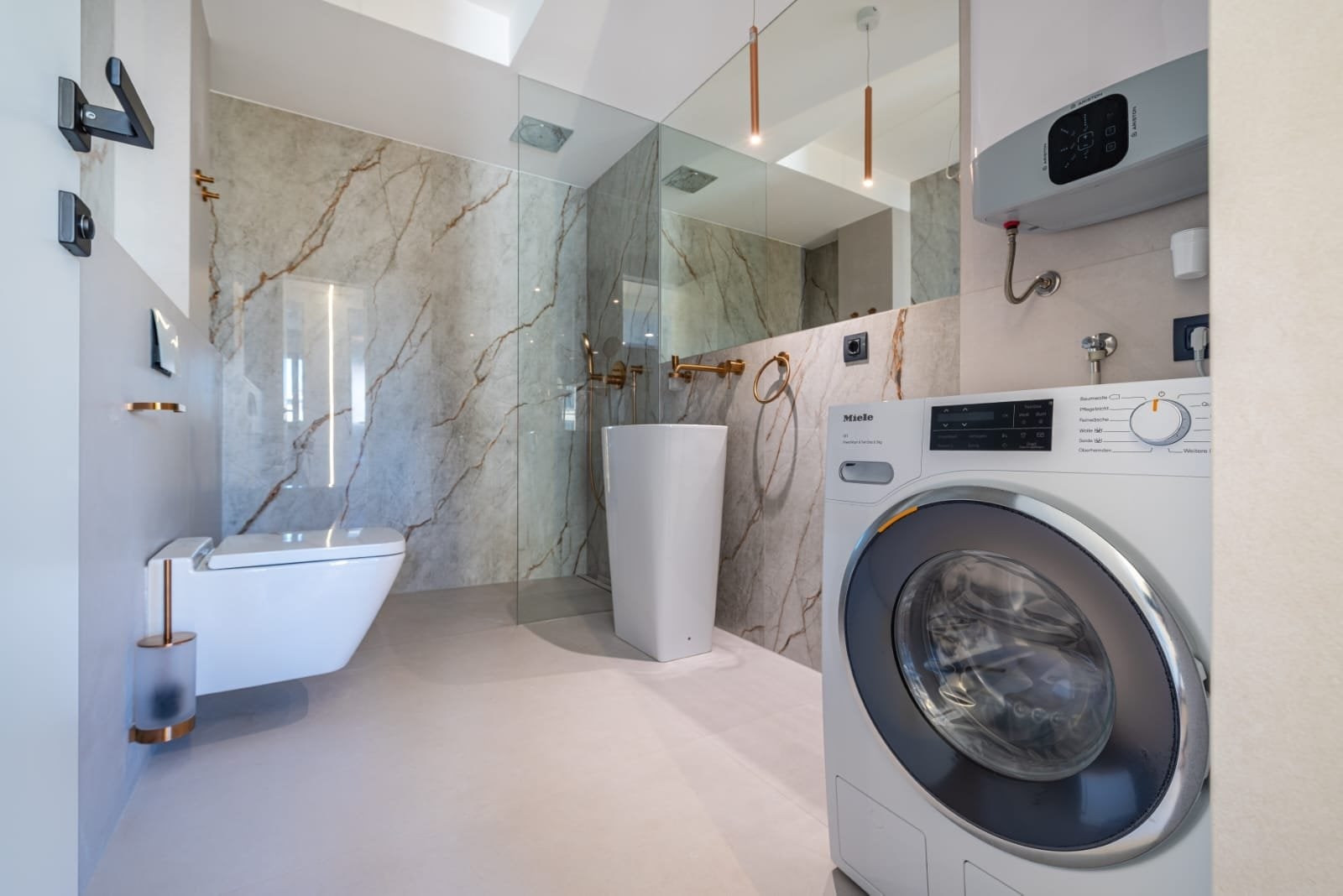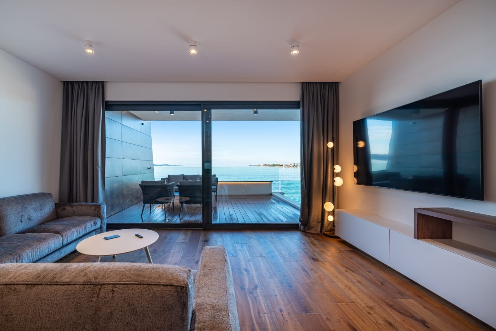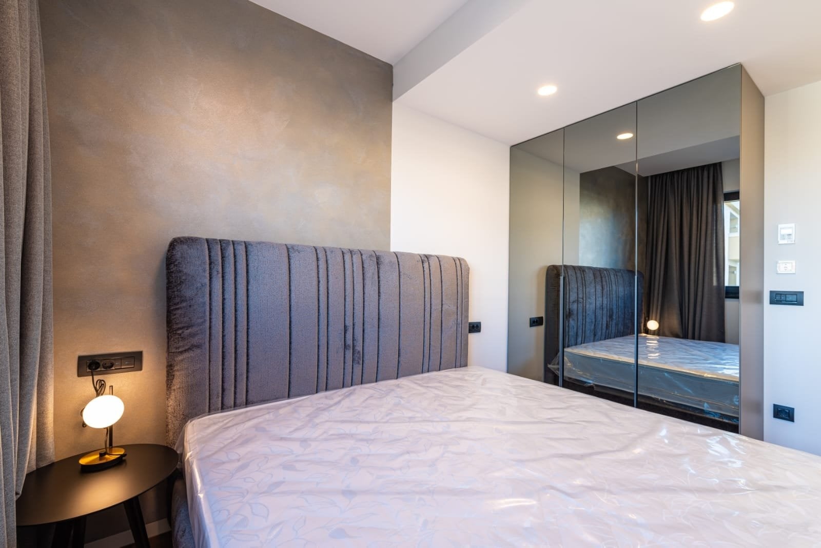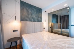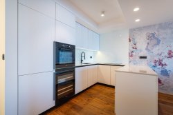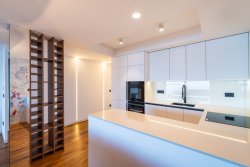 The apartment is finished to a high standard, including a smart home system. Every room is equipped with underfloor heating, air conditioning, and electrically controlled blinds. The apartment also comes with three outdoor parking spaces under a shelter.