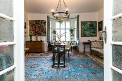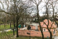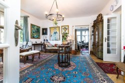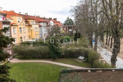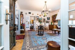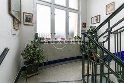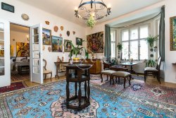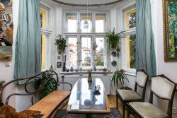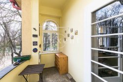 The whole house, facade, entrance areas (facade and interior spaces) and the apartment have preserved period elements (railings, windows, doors and doorframes, oak parquet floors. From the hall leads the opposite entrance to the main living area with bay window (27.9 sqm) the dining room and study (33.1 and 25.1 sqm) and the loggia (8.1 sqm) all three main rooms are connected by a double-winged door, the side entrance from the hall leading to the bedroom with a cloak room (28.1 sqm) and bathrooms. On the other side of the entrance another door leads to another bathroom, separate kitchen (14.9 sqm) and maid room (7.3 sqm).