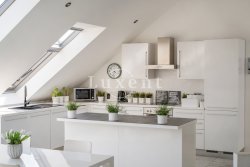 The apartment is entered through an entrance hall into a spacious living room with a kitchen and dining area (79 m²). From here, a modern staircase leads to the upper terrace with a view of Prague Castle and Petřín.
