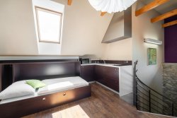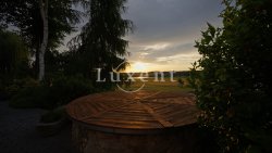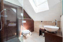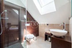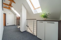 The house consists of two separate parts and has a capacity of 24 beds. The main part of the house has a restaurant with a bar, two types of kitchens, connecting corridors, technical and social facilities, and more on the first floor. On the second floor, there are five rooms, each with a bathroom, a spacious hallway, and a spiral staircase. In the second part of the property, there are two separate design studios, also with bathrooms and privacy. Each has its own electrical circuit and can be converted into an independent studio with a kitchenette or a designer maisonette. The lower studio has an 18 m² terrace and is prepared for a sauna. A classic fireplace can be installed on both the first and second floors. Without any modifications, the property could become a practical investment for business use.