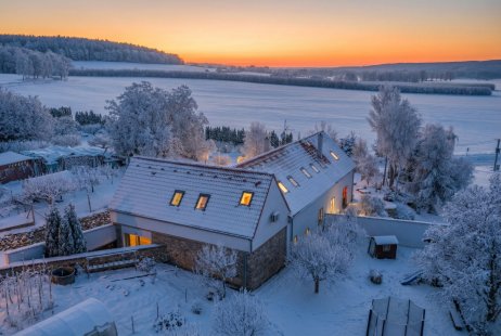 The advantages of the location are clean nature with forests and ponds, complete peace and quiet, and countless opportunities for active relaxation. Budějovice and the D3 motorway are just a few minutes away. There are many hiking and cycling trails in the immediate vicinity. The location is very lucrative from a business point of view – Golf Hluboká is 14 km away, Holašovice is 6 km away, and Český Krumlov, a UNESCO World Heritage Site with a rich cultural program throughout the year, is 30 km away. All amenities for modern living are available in nearby Budějovice – 14 km to the city center – and nearby Dubné (3 km) with a primary school, kindergarten, doctor, and shops.