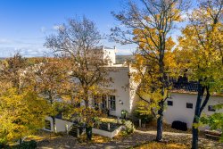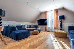 The next floor (304 m²) is mainly used for accommodation and wellness relaxation. There are six stylishly furnished rooms and seven bathrooms, three toilets, a urinal, a shower, two terraces, and two balconies with a total area of 96 m². The spacious roof terrace offers relaxation with a view of the surrounding countryside. There is a whirlpool (4 to 6 people), a Finnish sauna (6 to 8 people), and a massage room with two loungers. The ground floor features the aforementioned heated indoor pool. The tower (39 m²) with a viewing terrace (19 m²) crowns the entire building. Here you will find the Tower Suite with two bedrooms and another terrace with panoramic views.