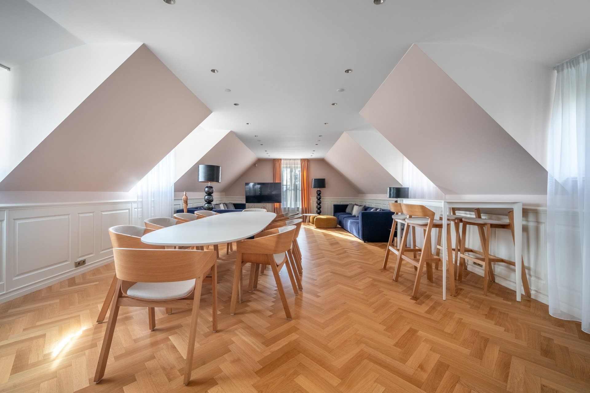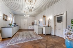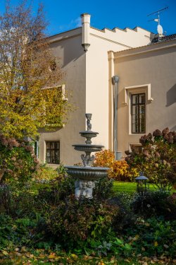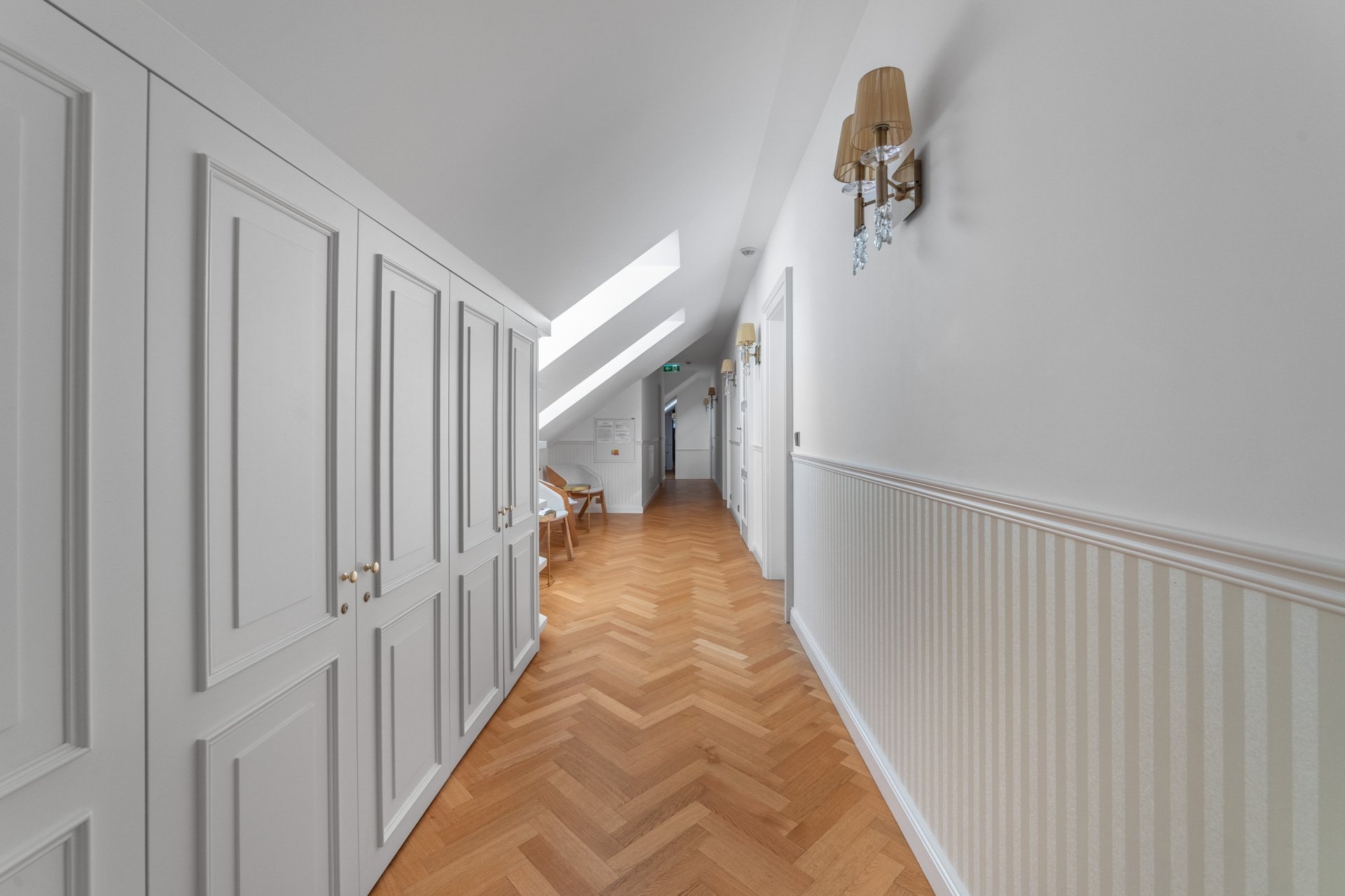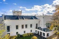 The main space is an elegant hall with a fireplace, which creates a majestic atmosphere, ideal for social gatherings. The hall connects to the terrace, which flows smoothly into the castle garden (4,253 m²) with a pond (1,536 m²), gazebo, and fountain. The garden is divided into two parts, the first of which is designed in a free, romantic English style, while the second is conceived in a formal, geometrically precise, symmetrical French style. On the ground floor of the castle, there is also a large apartment with bathrooms, an office, a bar, a wine cellar (26 m²), an elegant castle