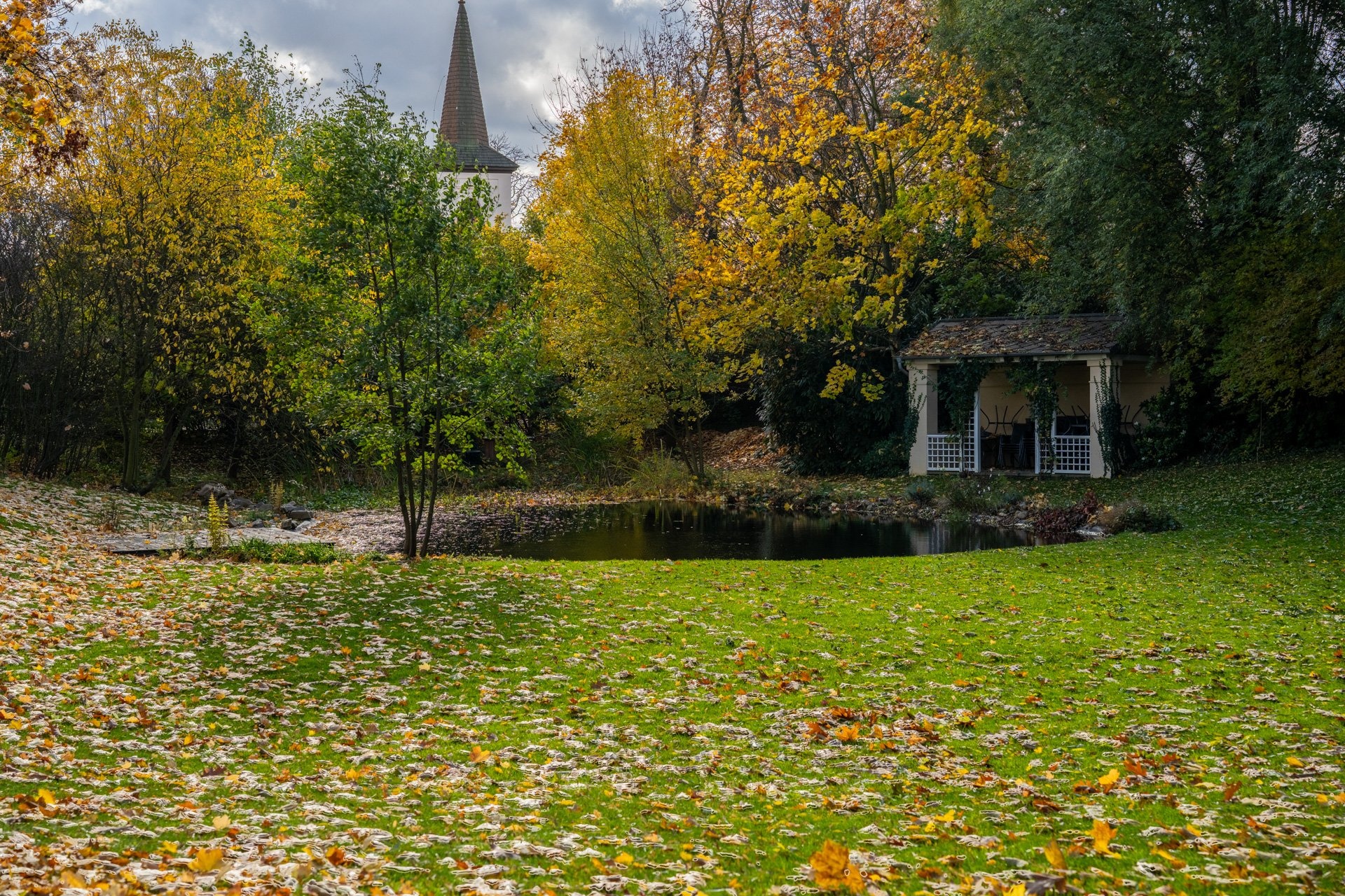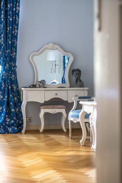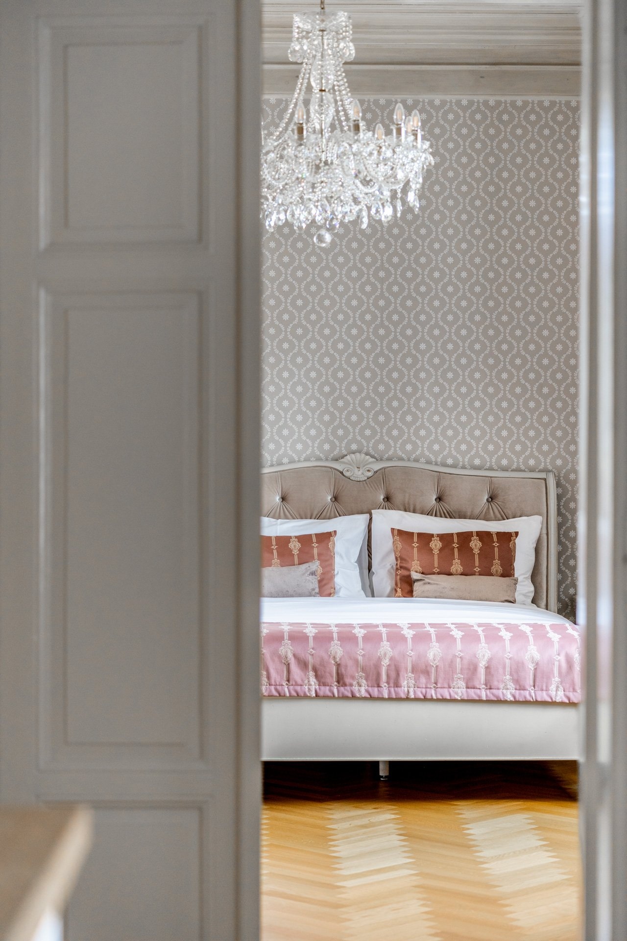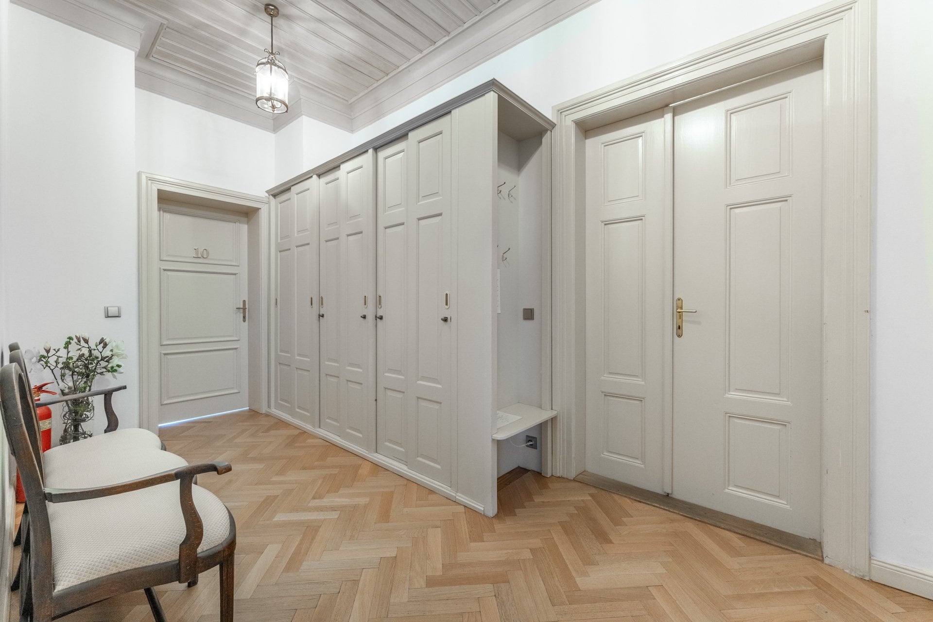 The main space is an elegant hall with a fireplace, which creates a majestic atmosphere, ideal for social gatherings. The hall connects to the terrace, which flows smoothly into the castle garden (4,253 m²) with a pond (1,536 m²), gazebo, and fountain. The garden is divided into two parts, the first of which is designed in a free, romantic English style, while the second is conceived in a formal, geometrically precise, symmetrical French style. On the ground floor of the castle, there is also a large apartment with bathrooms, an office, a bar, a wine cellar (26 m²), an elegant castle