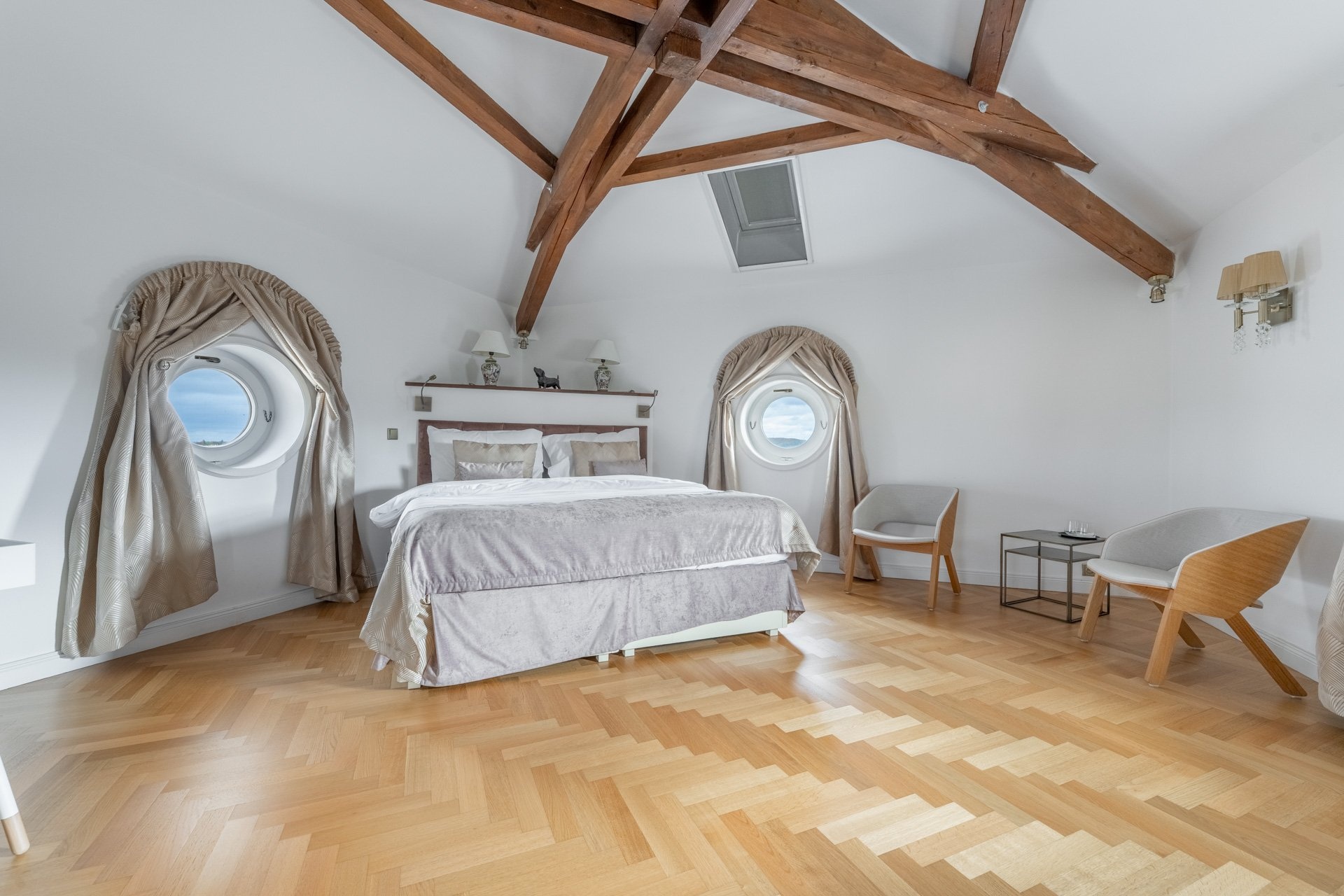 The upper floors feature two halls, dining rooms, and bedrooms with en suite bathrooms (total accommodation capacity is 22 people, 10 bedrooms). The wellness area located on the terrace offers a hot tub for 4 to 6 people, a sauna with a capacity of 6 to 8 people, a massage room, and a heated indoor pool (on the ground floor).