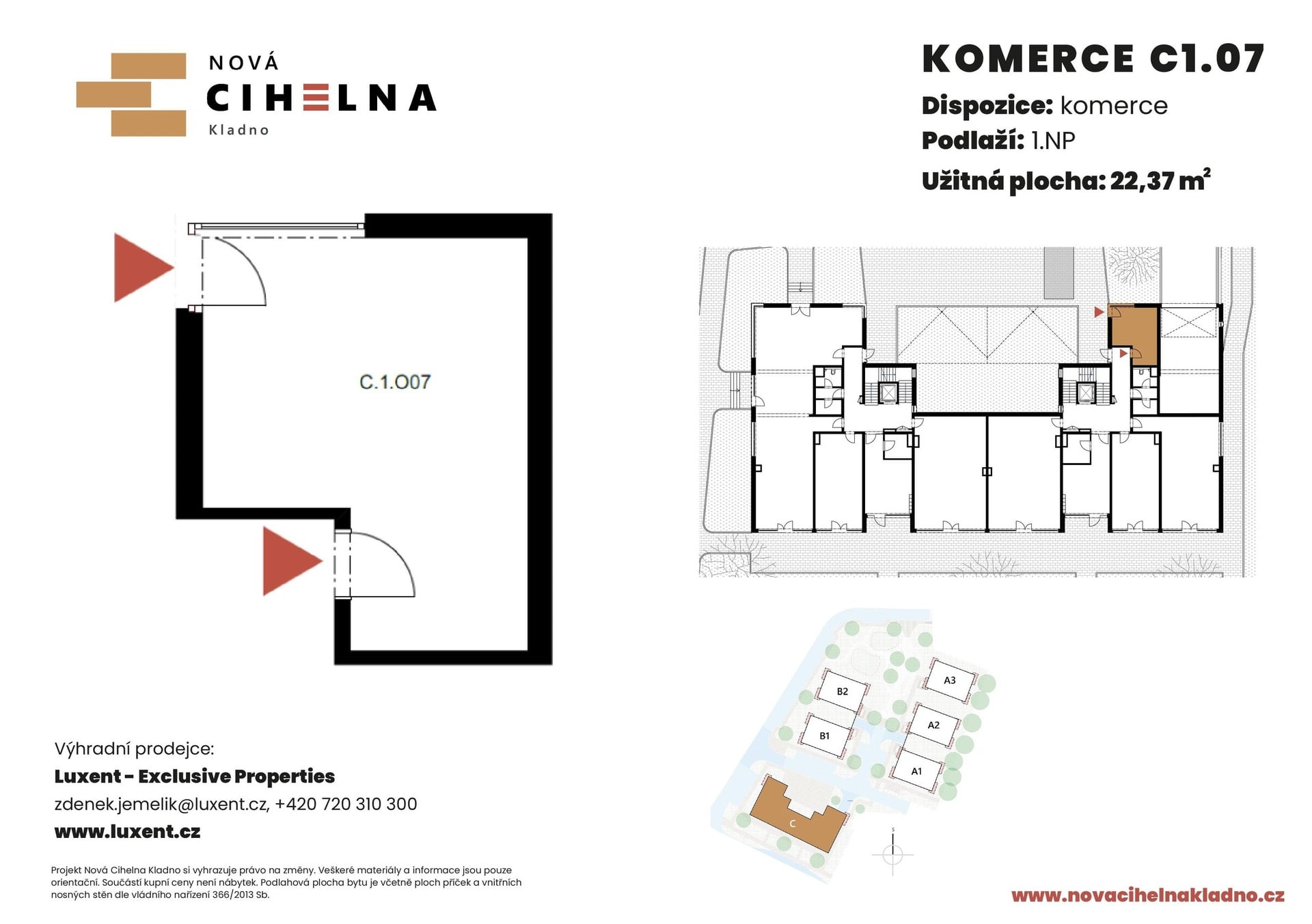 We offer for sale a commercial unit with a usable area of 22.37 sqm in an extremely economical development project Nová Cihelna Kladno, located in the urban area of Kladno - Rozdělov.