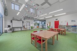 The first floor is accessible via a separate entrance from the garden, which allows for the separate functioning of individual parts of the building. This part contains two more classrooms with accessories and a separate 2+kk apartment with an area of 49 m². This can serve as a service apartment, offices, or facilities for other activities. The building is situated in the middle of a fenced plot and is surrounded on all sides by a carefully landscaped garden. This was designed with an emphasis on safety and the play value of outdoor activities. The mature greenery and layout of the garden create a pleasant microclimate and a natural space for children to play and relax.