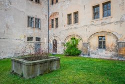 Originally, a Gothic fortress stood at this location. The oldest part is the cellar under the southwest corner of the castle building covered with a barrel vault, as well as some linings of the entrances and windows. In another medieval construction phase, the eastern side of the main wing was likely added, as evidenced by dividing walls and cross-vaults without ridges in some rooms. The Renaissance remodeling had a crucial impact on the current size of the castle. At that time, a two-story west wing was built as was a south wing, elevated by another floor on the level of the newly built west wing. The west wing was adorned with arcades on the courtyard side at all levels. The Baroque transformation followed, with the entrance gate to the courtyard decorated with rusticated pilasters and a segmented gable. A stone fountain was installed, and the arcades in the west wing were bricked up on the courtyard side. Simple and group windows were inserted into these walls. A small castle chapel was established on the second floor of the south wing. There are impressive Baroque doors leading to the rooms at the same floor. The ceilings here have profiled stucco mirrors.