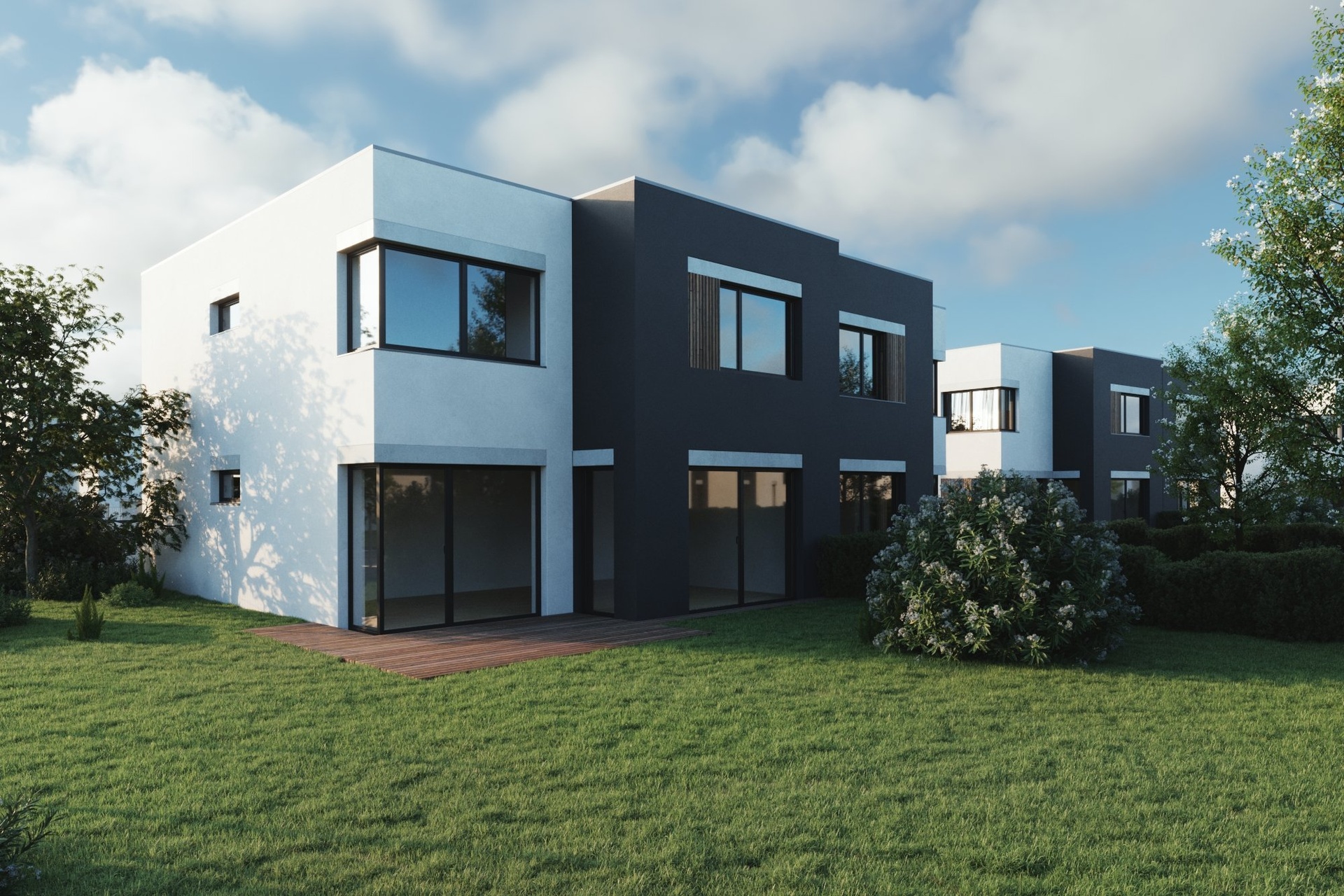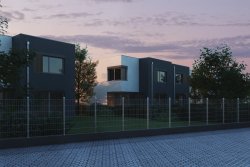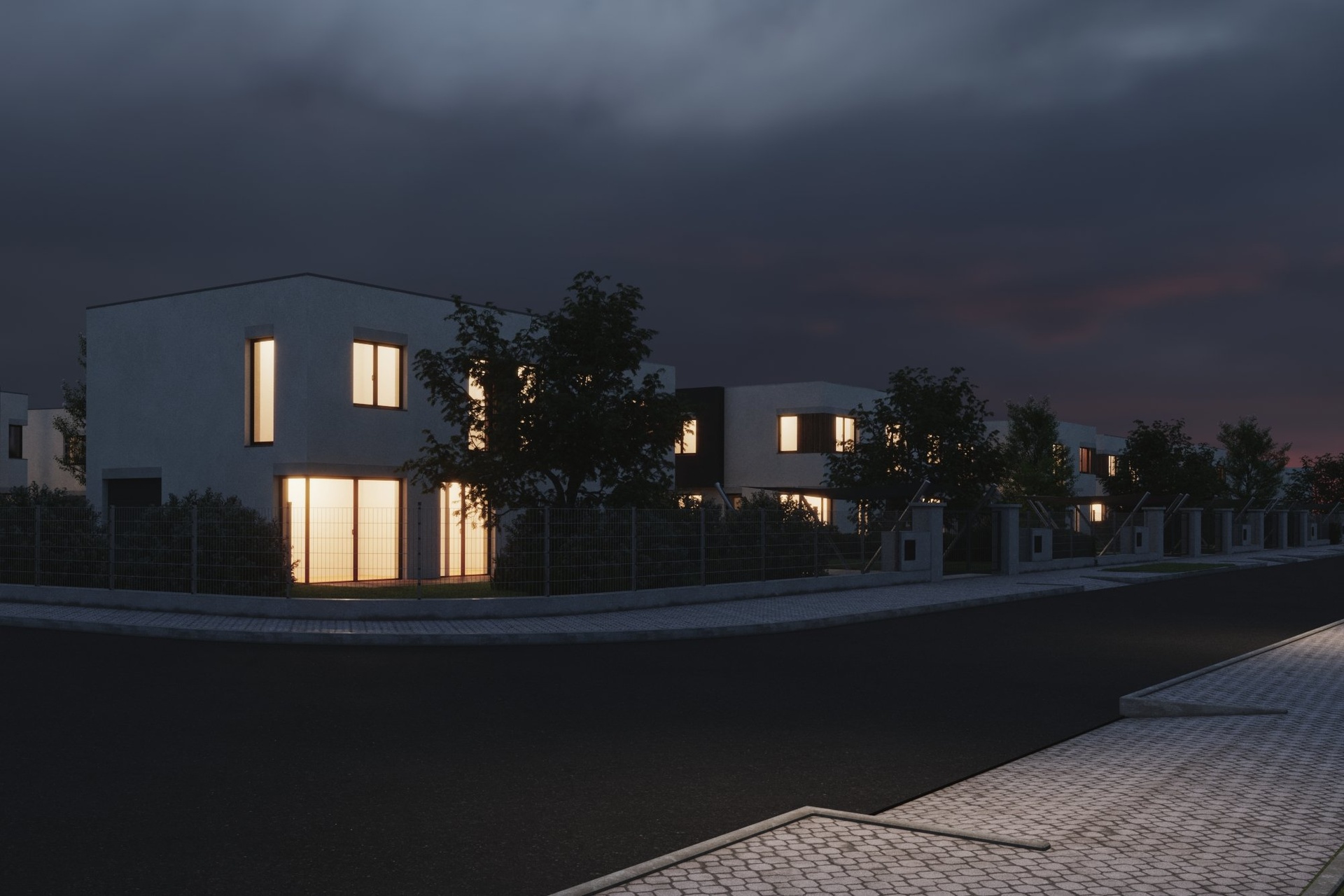 On the ground floor there is a hall, bathroom, laundry room, tech. room and then a living room pleasantly glazed to the garden and terrace. There is also an integrated garage with preparation for a charging station. Upstairs there is then a master bedroom with en-suite bathroom and dressing room, two children's bedrooms with a second bathroom and a storage room. The corridor above the staircase is illuminated by a skylight with preparation for electric drive. See attached floor plans for more details. On the floors there is quality laminate floating flooring (decor according to the house) and ceramic tiles. Bathroom equipment: Villeroy & Boch.