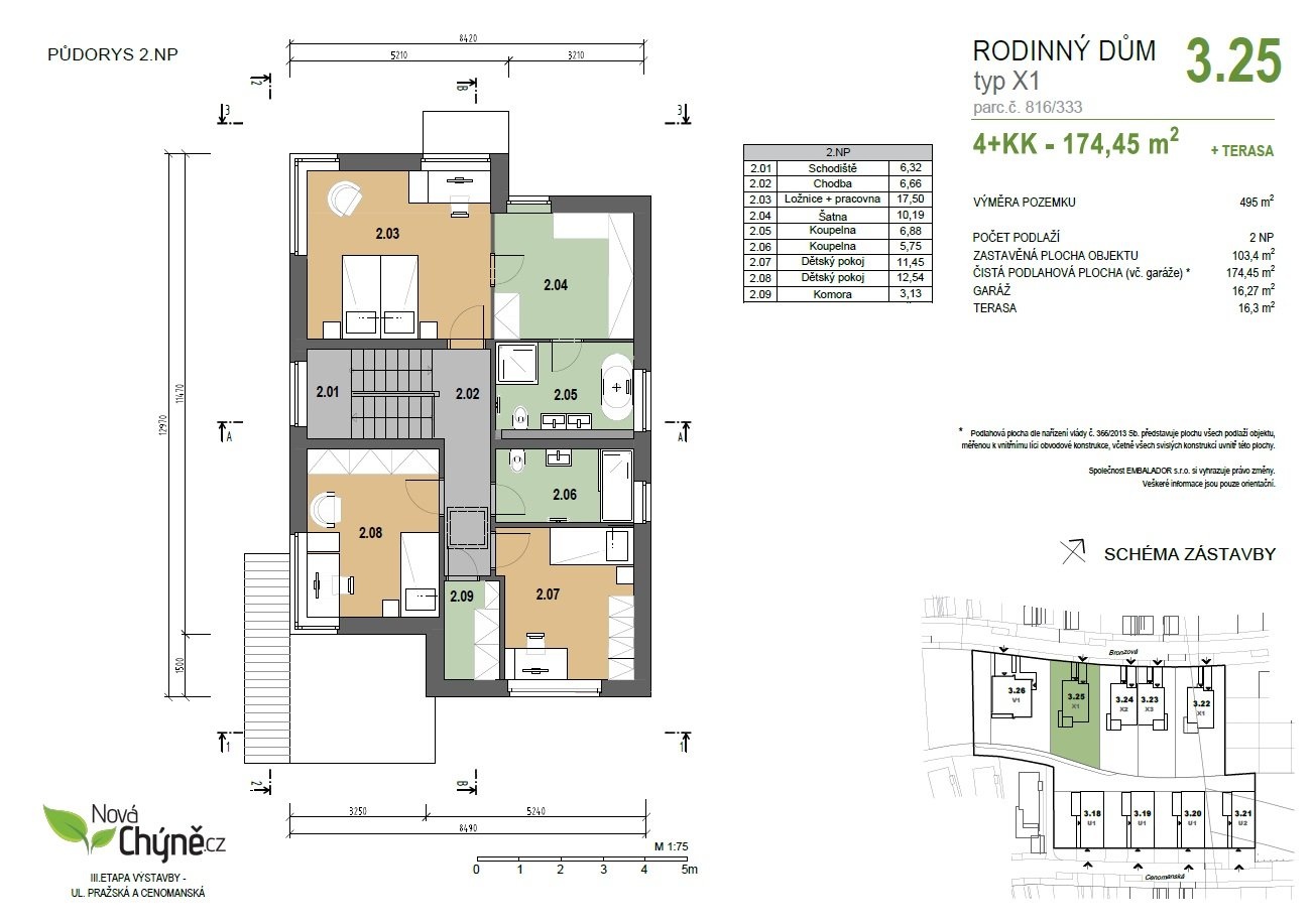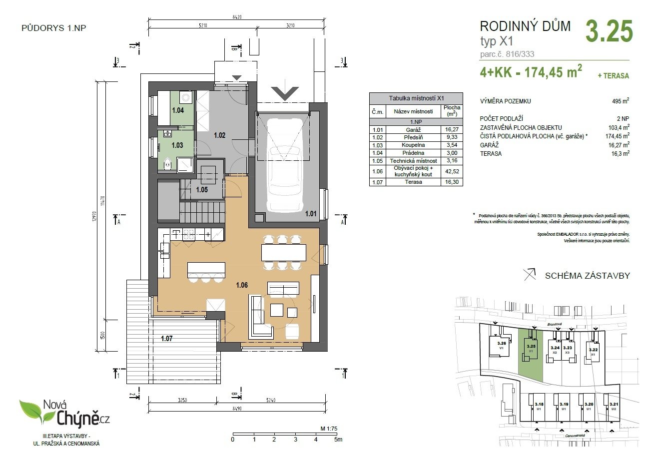 We offer a detached family house with a sunny garden in the project NEW CHÝNĚ, on the western outskirts of Prague - in the town of Chýně - with a commute of 14 km to the center of Prague. The project satisfies with location, quality of brick houses with practical layouts and gardens and technological sophistication. The offered family house has a layout of 4+kt, floor area of 174.4 sqm, total usable area of 174.5 sqm, including a terrace of 16.3 sqm. It stands on a plot of 495 sqm with a garden of 391 sqm. The house includes a garage for one car and one additional park. The parking is on its own plot.