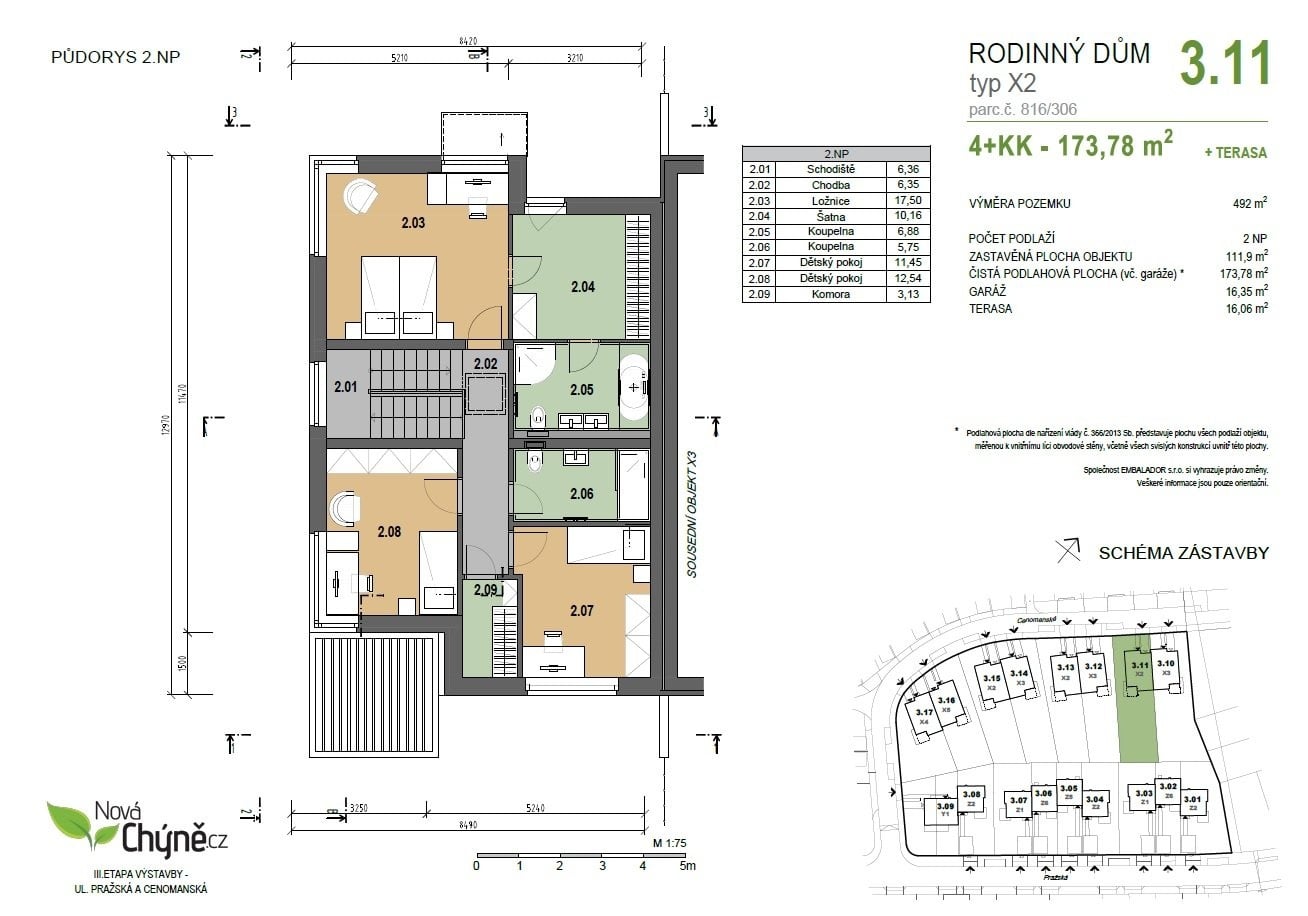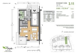 We offer an economical family house with a garden in the project NEW CHYNĚ, on the western outskirts of Prague - in the village of Chýně - with a commute of 14 km to the center of Prague. The project satisfies with its location, quality of brick houses with practical layouts and gardens and technological sophistication. The offered family house is brick, has a layout of 4+kt+G, floor area of 173.8 sqm, a terrace of 16 sqm. It stands on a plot of 492 sqm with a garden of 380 sqm. The house includes a garage for one car and one additional park. The parking is on its own plot.