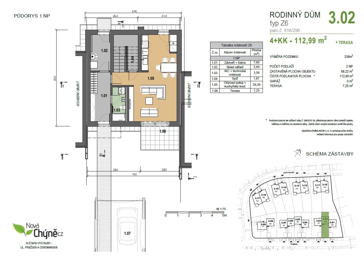 We offer an economical family house with a garden in the project NEW CHYNĚ, on the western outskirts of Prague - in the village of Chýně - with a commute of 14 km to the center of Prague. The project will satisfy with the quality of the location, brick houses with practical layouts and gardens and technological sophistication. The offered house has a layout of 4 + kt, floor area of 113 sqm total usable area of 107.5 sqm - of which a terrace of 7.24 sqm. It stands on a plot of 238 sqm - of which a garden of 169 sqm. The house includes one parking space on its own plot.