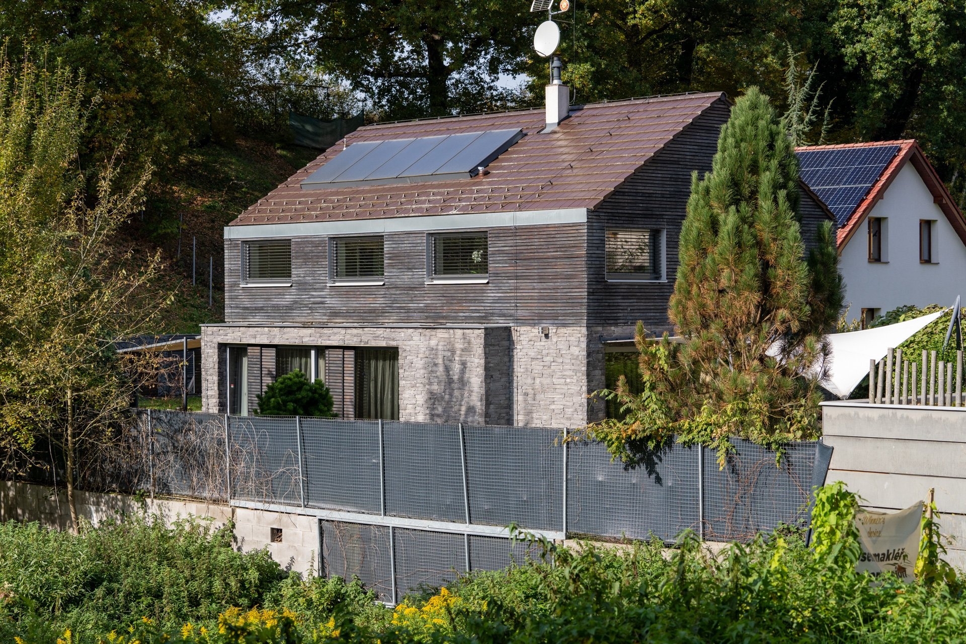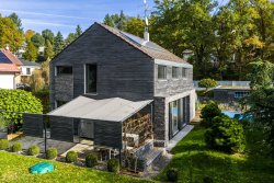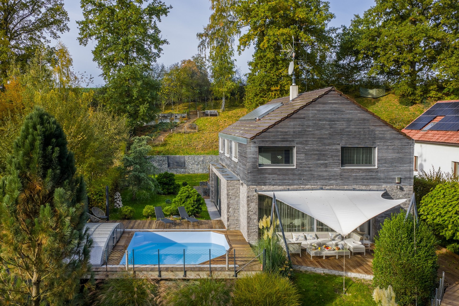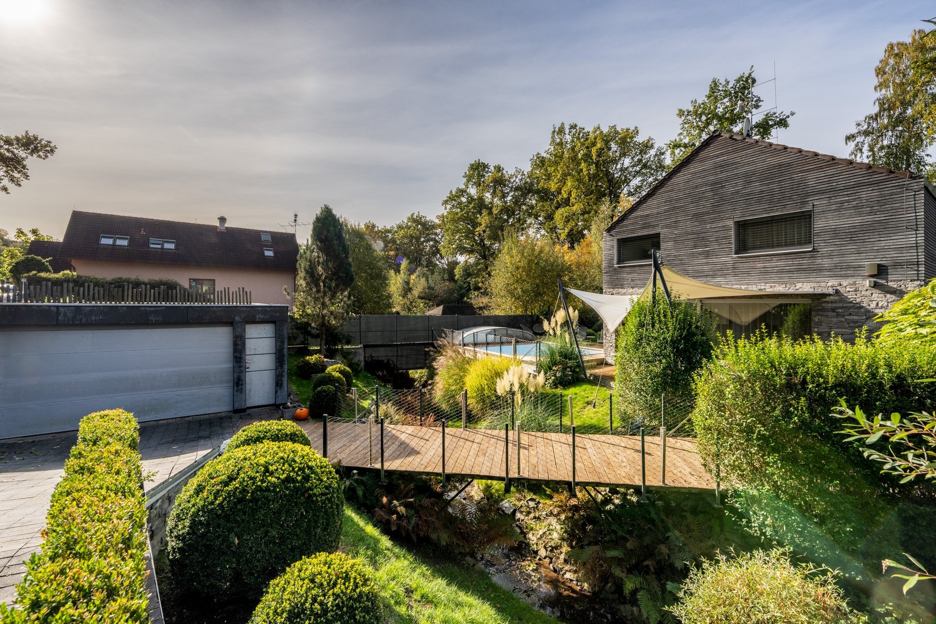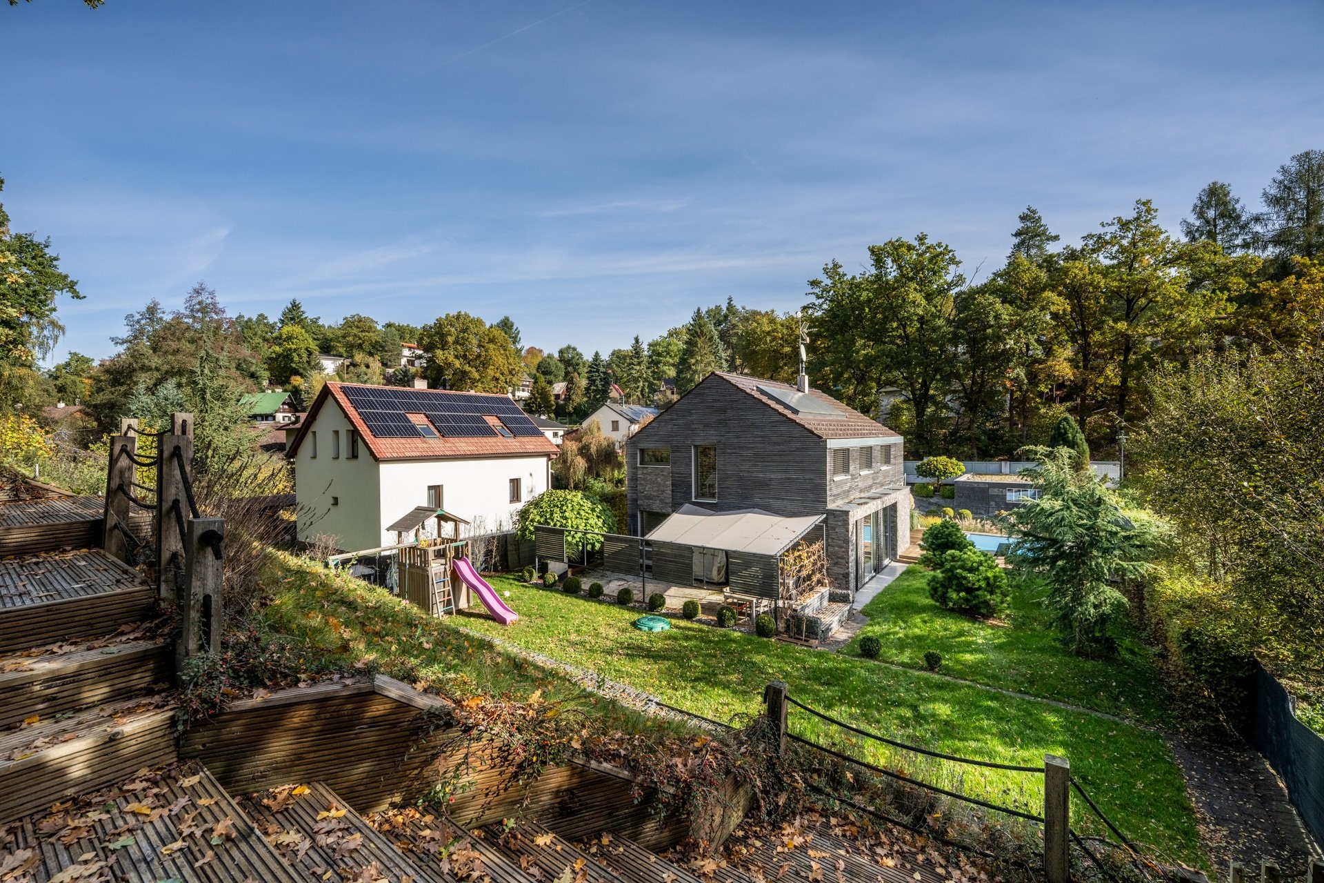 We are offering for sale a two-story 5+kk family house with a total usable area of 185 m², which was built in 2011. The house represents architecturally imaginative modern living, sensitively set in the picturesque surrounding nature of Hrusice. The southeast-facing villa ingeniously works with all the elements: water is represented by an outdoor pool and a stream on the property, a large garden provides earth, air flows through large windows and doors, and fire is tamed in the fireplace.