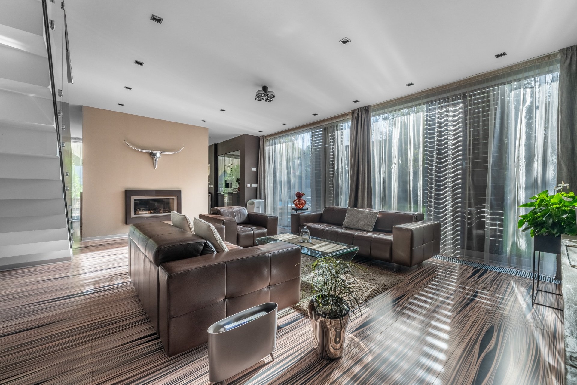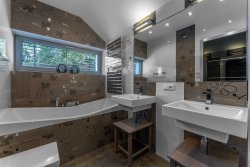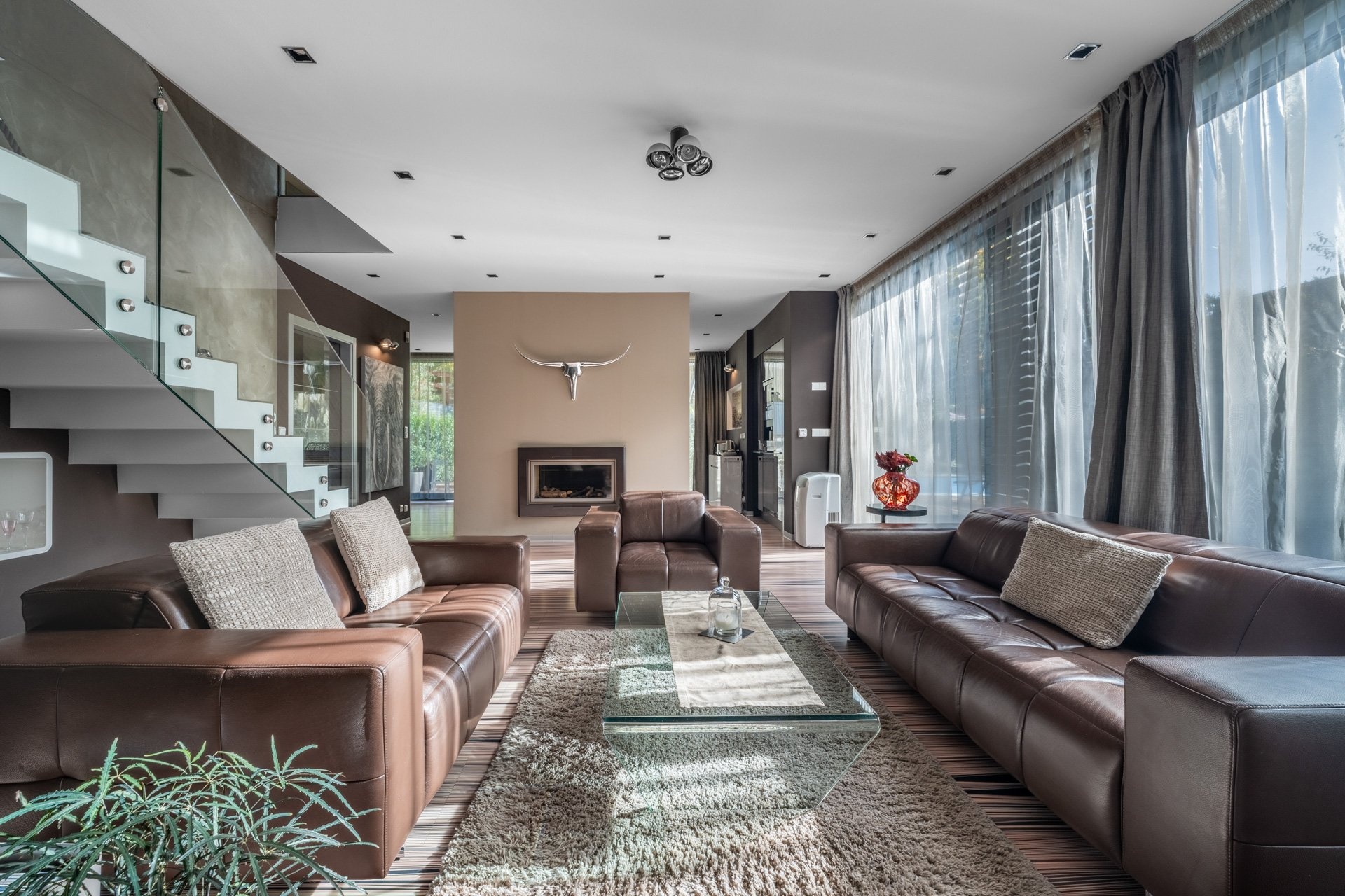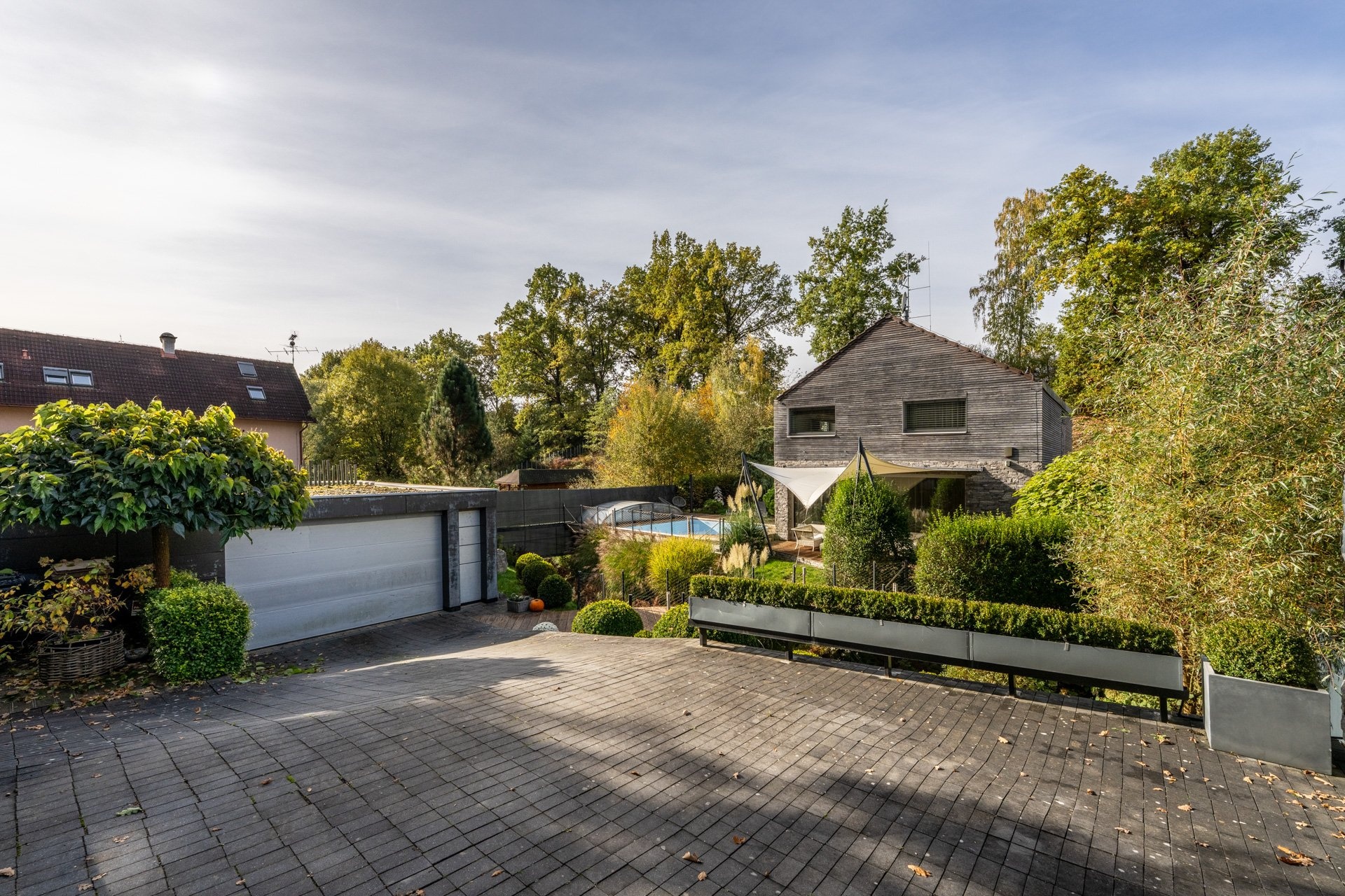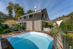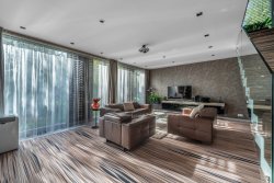 We are offering for sale a two-story 5+kk family house with a total usable area of 185 m², which was built in 2011. The house represents architecturally imaginative modern living, sensitively set in the picturesque surrounding nature of Hrusice. The southeast-facing villa ingeniously works with all the elements: water is represented by an outdoor pool and a stream on the property, a large garden provides earth, air flows through large windows and doors, and fire is tamed in the fireplace.