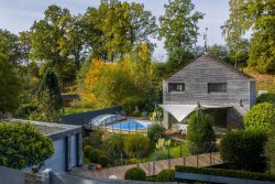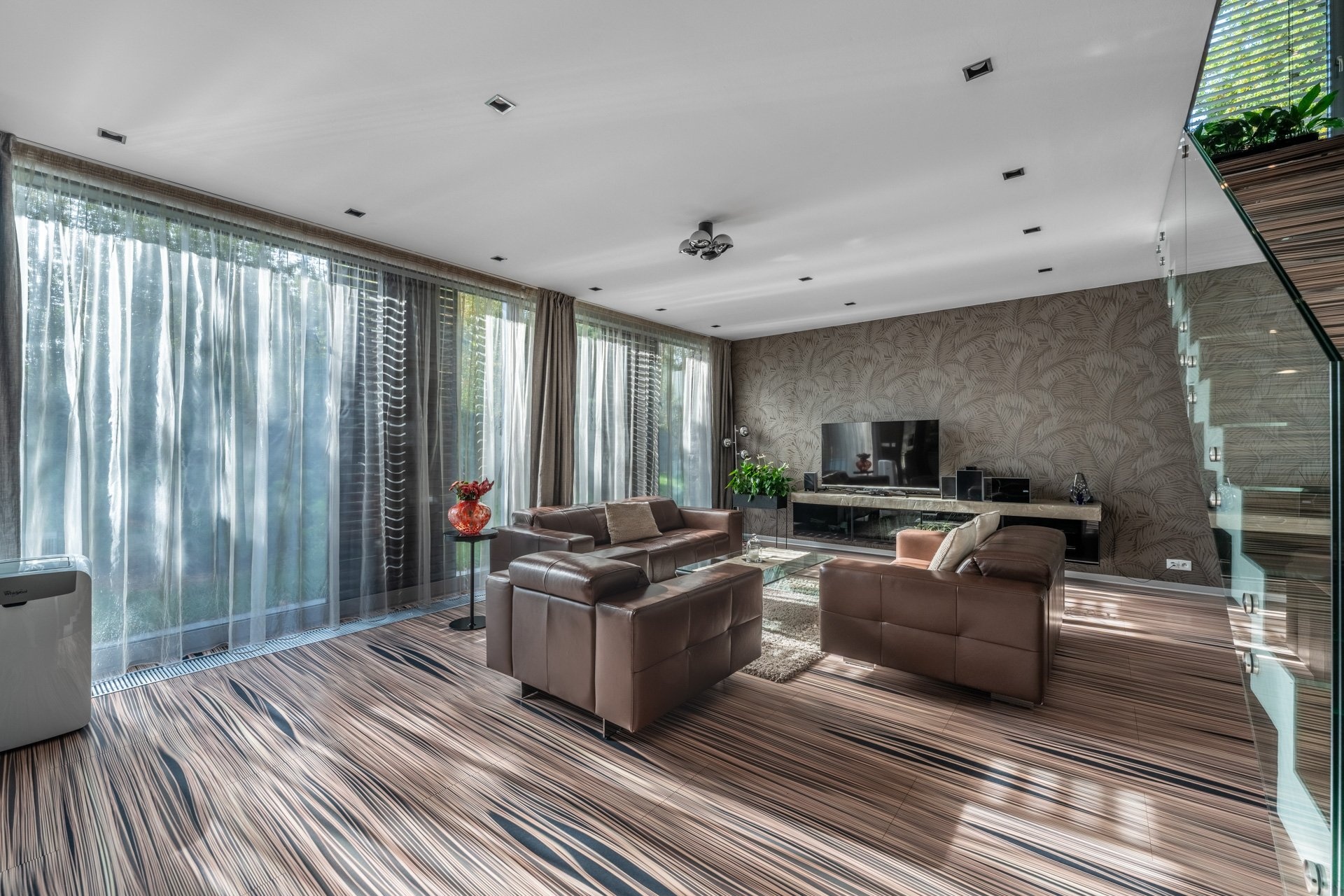 The ground floor of the house consists of an open space, which includes an airy living room (39 m²) connected to a kitchenette with a dining area (28 m²). The kitchen has direct access to the outdoor terrace, which is covered by a shading membrane designed by architect Zdeněk Hiršl and offers a pleasant seating area with a view of the flowing stream and the pool. There is also direct access to the covered swimming pool (25 m²) with an outdoor shower from the living room. The ground floor of the house also includes a study, a vestibule with a cloakroom, a utility room, and a separate toilet.