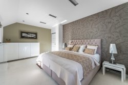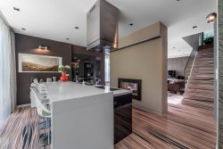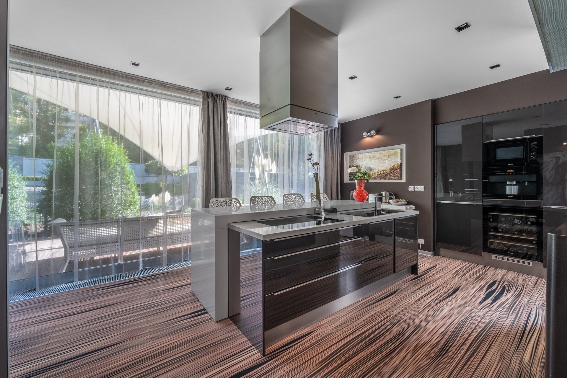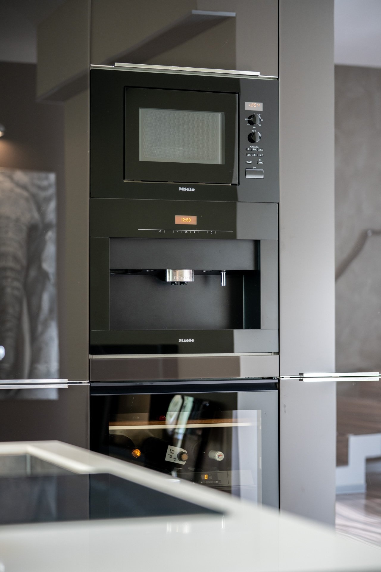 The kitchen is equipped with top-of-the-line Miele appliances: a steam and convection oven, induction hob, microwave, built-in refrigerator, coffee maker, wine cooler, and a very practical warming drawer for tableware.