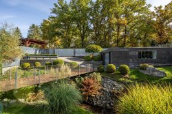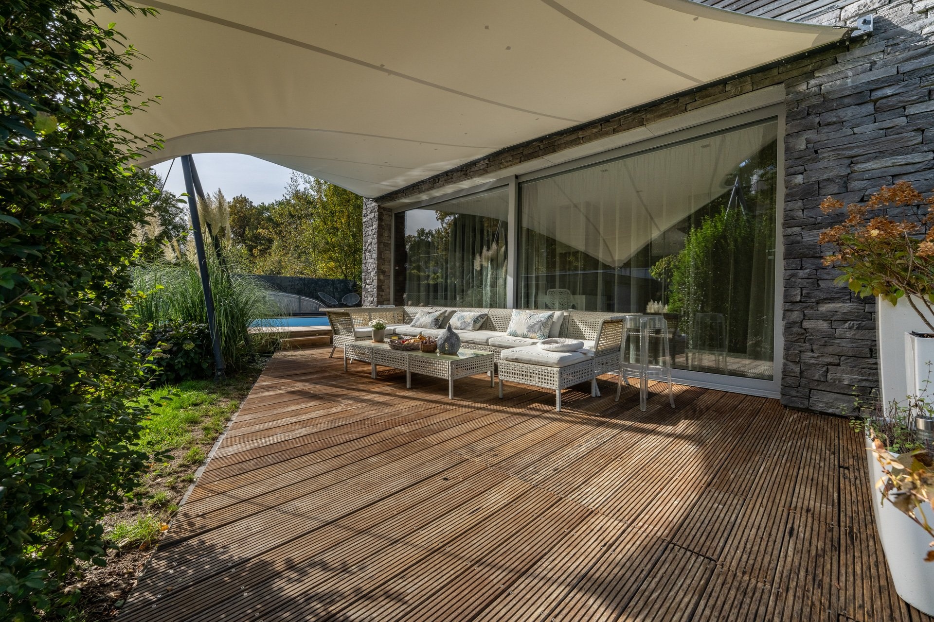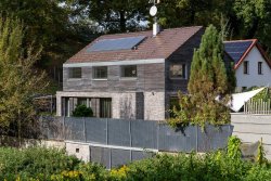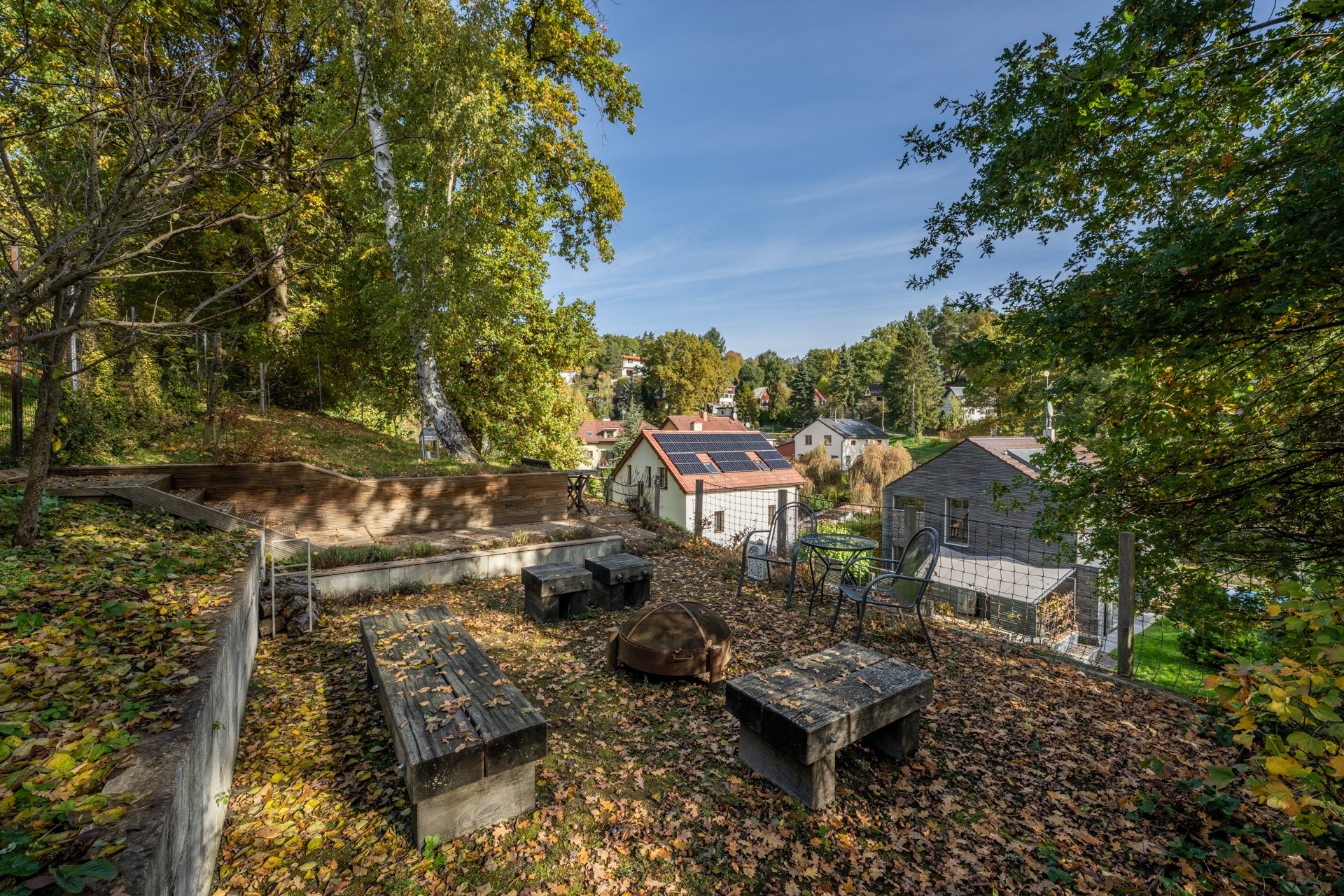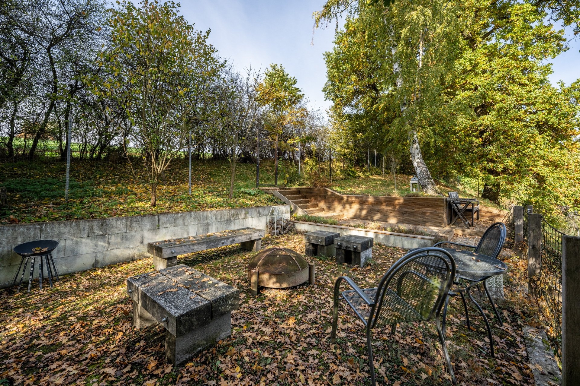 At the rear of the house is a second shaded terrace, suitable for barbecuing, for example, which is connected to the open space of the garden. The slope by the garden is used as a maintenance-free green area, and stairs lead to the upper part, where there is a fireplace with a beautiful view of the surroundings.