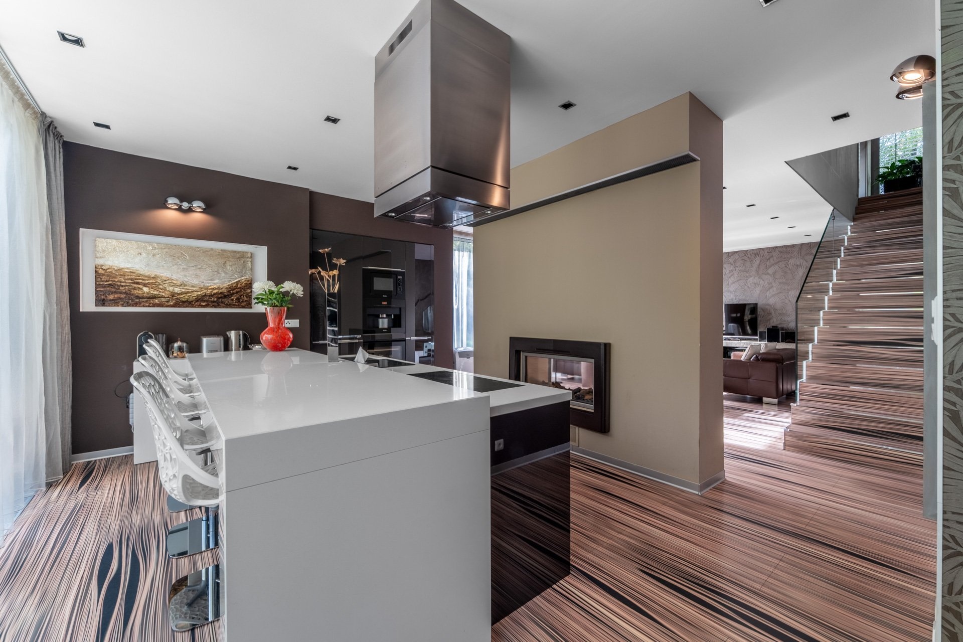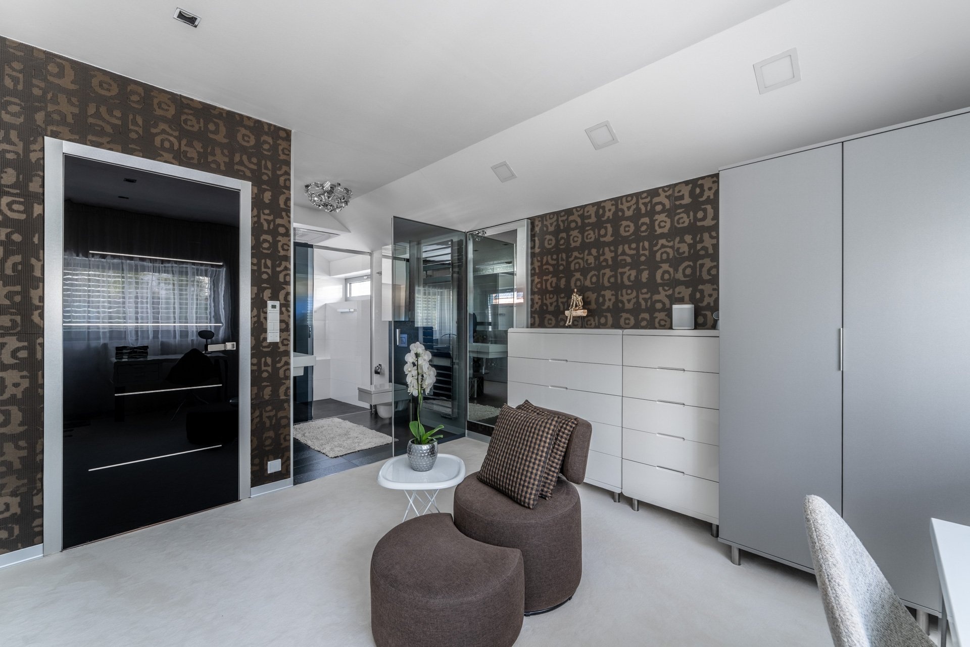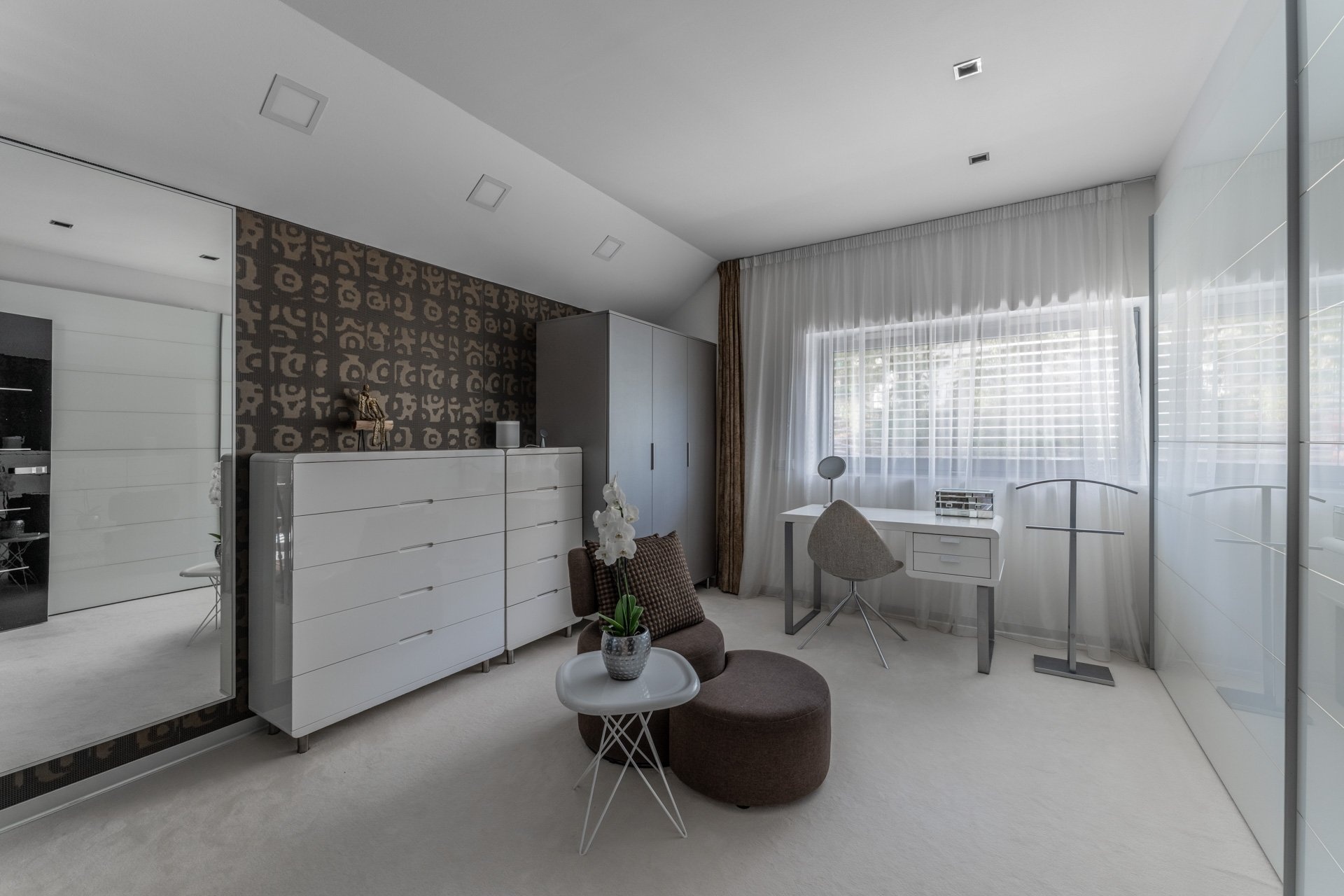 The utility room has a Miele washing machine and dryer, a Husky central vacuum cleaner, and a Junkers gas boiler that heats the house. The entire house has underfloor heating, Parador laminate flooring, and wall-to-wall carpeting in the bedrooms.