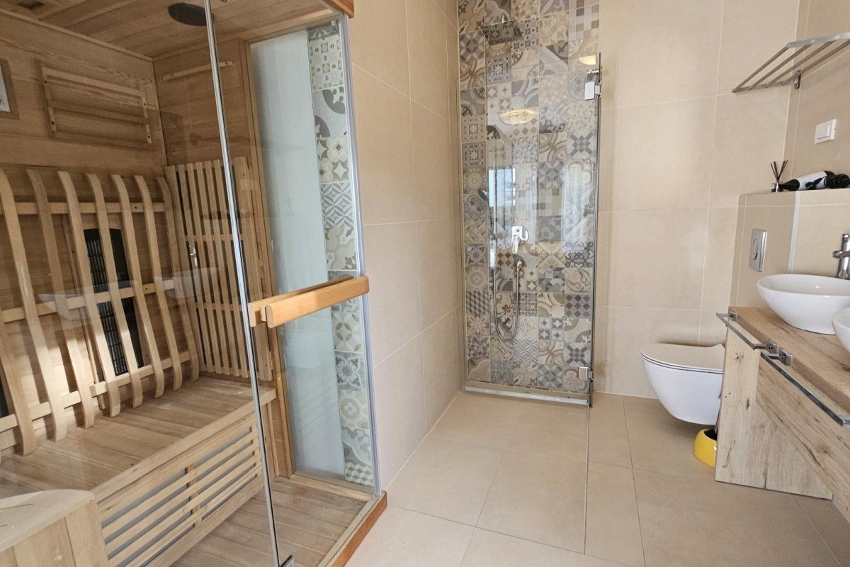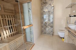 On the ground floor there is a spacious living room with kitchen and dining area, a bedroom with en-suite bathroom and infrared sauna, and an open lobby area with a hot tub. On the first floor there are three bedrooms, each with its own bathroom and terrace with panoramic sea views.