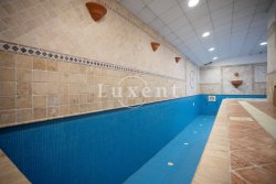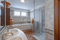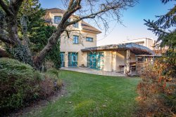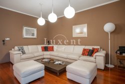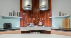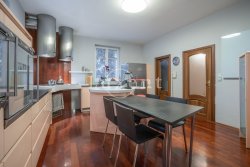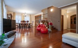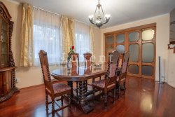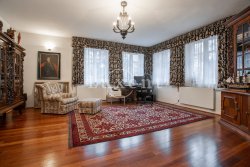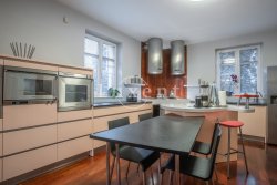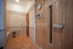 On the ground floor we enter to the living area through a vestibule and a hall (10.7 sqm), the living area is connected to a dining room (64.5 sqm) and allows direct access to the outdoor terrace connected with the garden. Double doors separate modern and functionally designed kitchen (25.8 sqm) equipped with Gaggenau and Siemens appliances. Pleasant relaxation can be enjoyed in sauna, cooler and swimming pool, which is equipped with counter currents. On the ground floor there is a pantry, toilet and shower. On the beautifully designed stairs leading directly from the living area, you get to the second floor, mall salon (30.2 sqm), guest bedroom (10.6 sqm) with bathroom, bedroom with balcony (29.3 sqm) and main bathroom (13.3 sqm) with underfloor heating, also a dressing room, laundry and loggia. The third floor has two rooms (24.7 and 30.1 sqm), a bathroom and a spacious hall (48.8 sqm) which is currently used for fitness purposes.