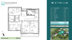 RD 3 is a basement, family house with a layout of 7+kt, with a total floor area of 349.5 sqm and a plot size of 1069 sqm. On the ground floor there is a spacious entrance hall with a corridor (8,2 sqm), where a large space for the installation of wardrobes is foreseen, a bathroom with shower, a separate toilet, a utility room with heat pump, a study (19.9 sqm), a guest room (17.6 sqm) and a living room with kitchen (81.6 sqm), which is beautifully separated, taking advantage of the multi-level space on the ground floor.