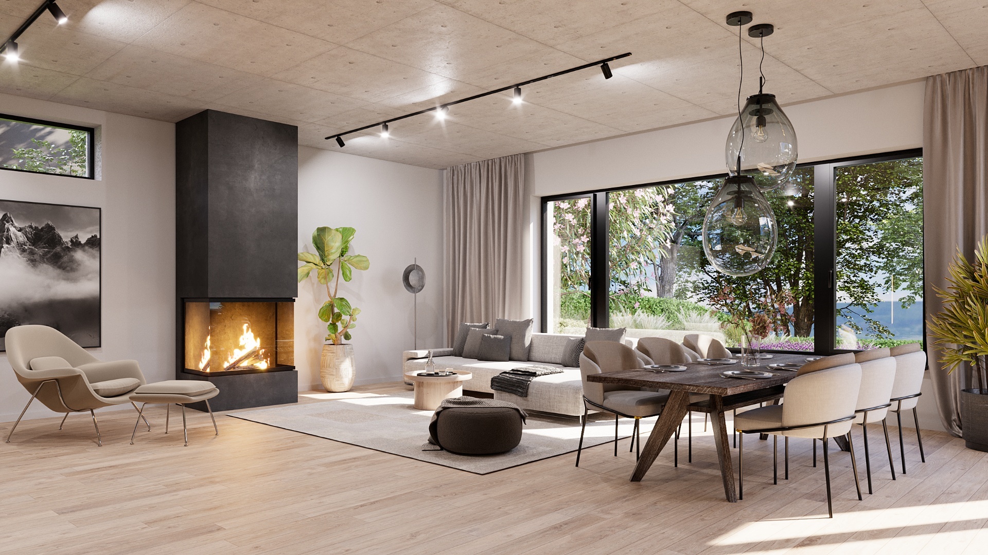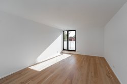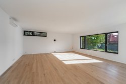 From the generous light-filled living room and kitchen there is access to the terrace and the garden of the house. A nice detail and dominant feature of this space is the glass corner that passes from the living area to the kitchen and provides access to the terrace.